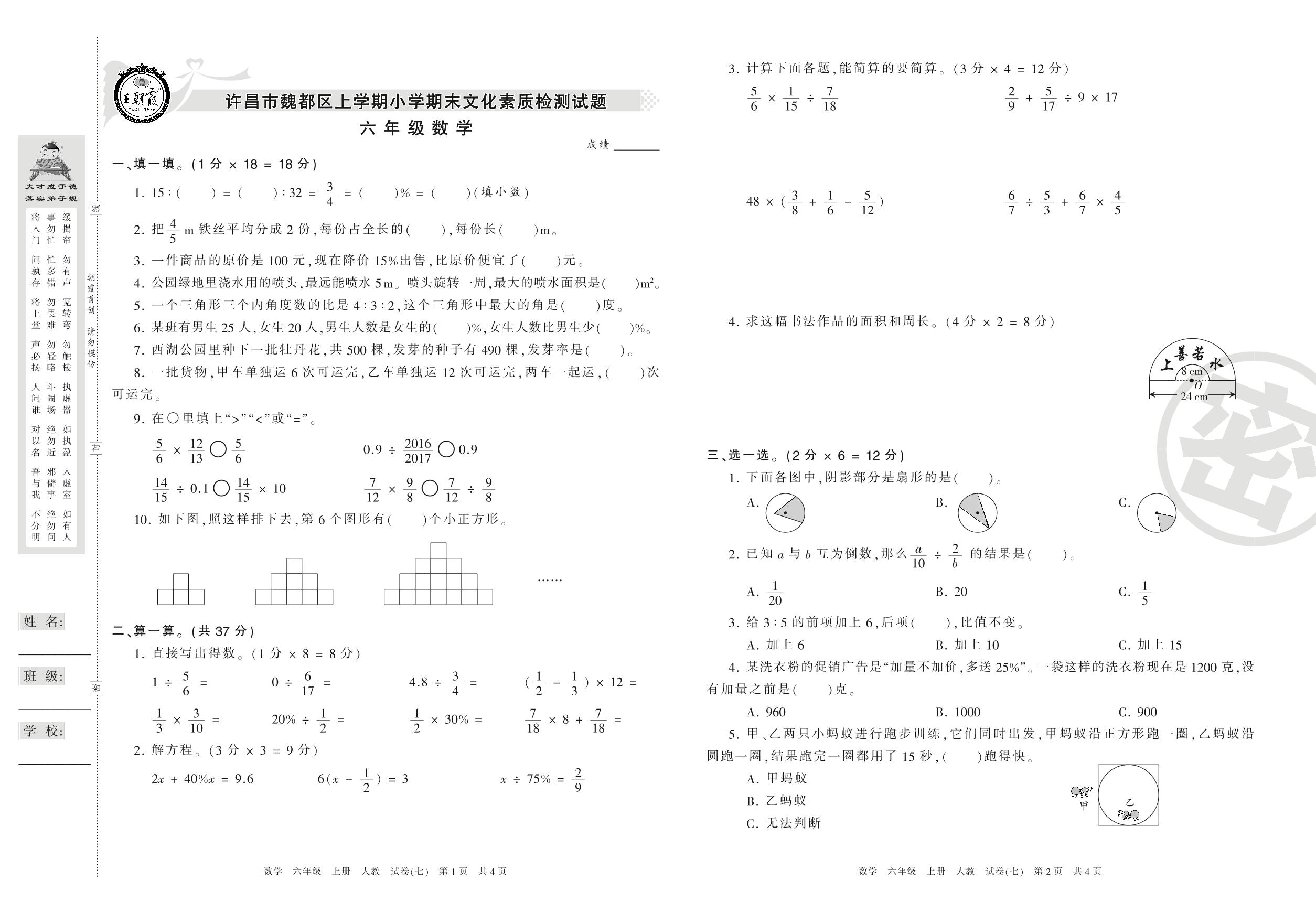 2016-2017学年第一学期许昌市魏都区六年级数学试卷(人教版)【7】