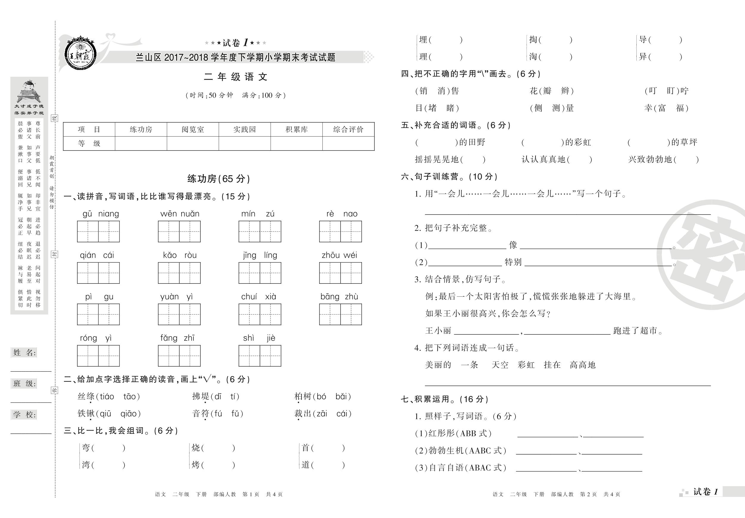 2017-2018学年第二学期临沂市兰山区二年级语文试卷(人教版)【1】