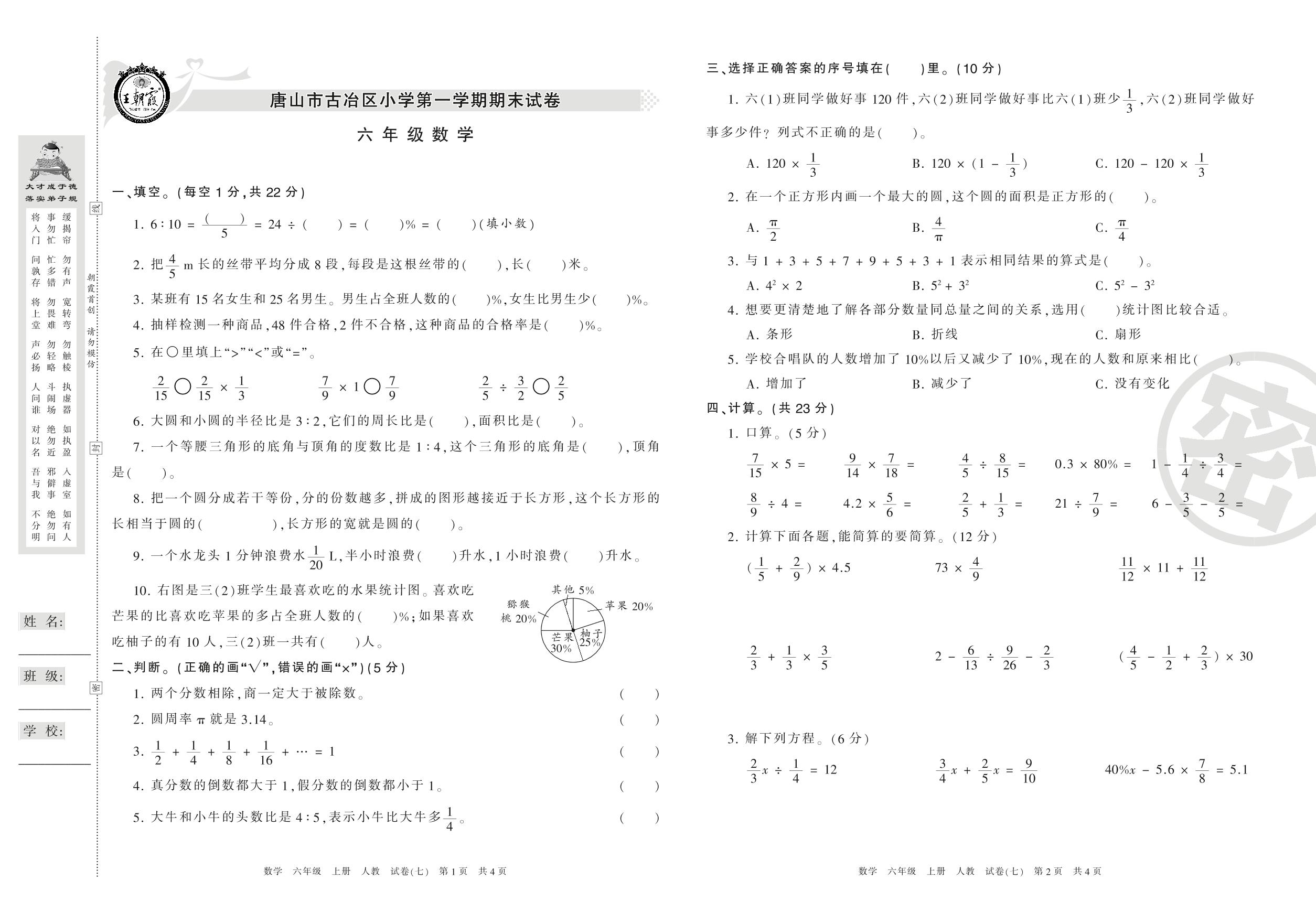 2016-2017学年第一学期唐山市古冶区六年级数学试卷(人教版)【7】
