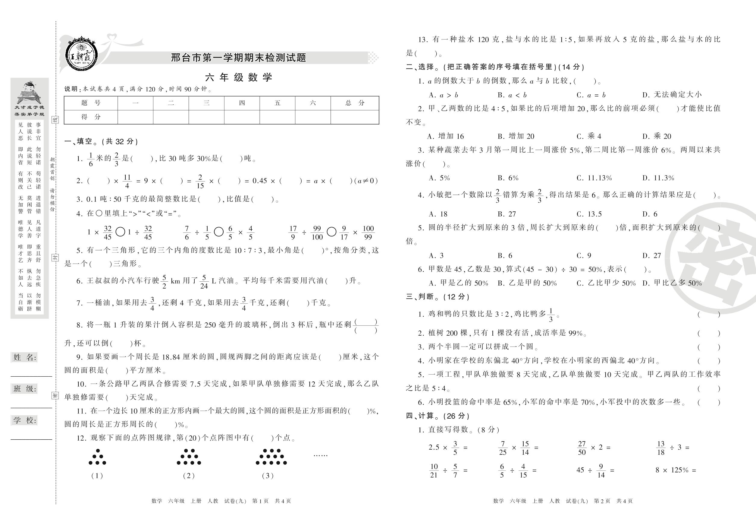 2016-2017学年第一学期邢台市六年级数学试卷(人教版)【9】
