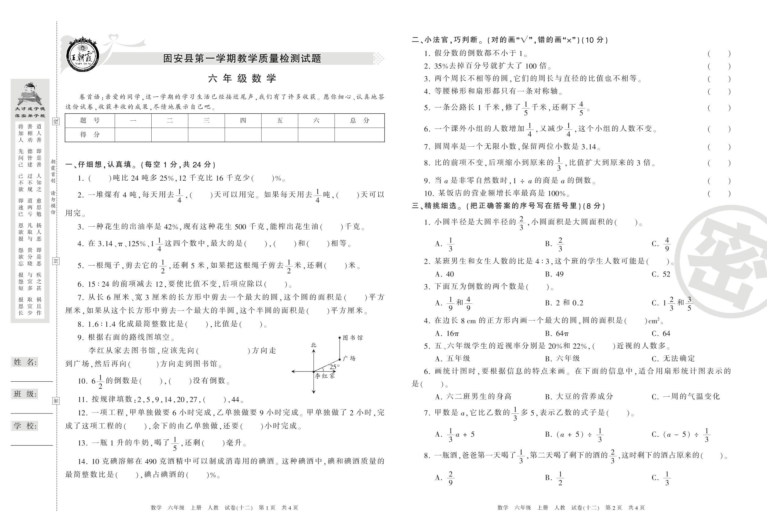 2016-2017学年第一学期廊坊市固安县六年级数学试卷(人教版)【12】