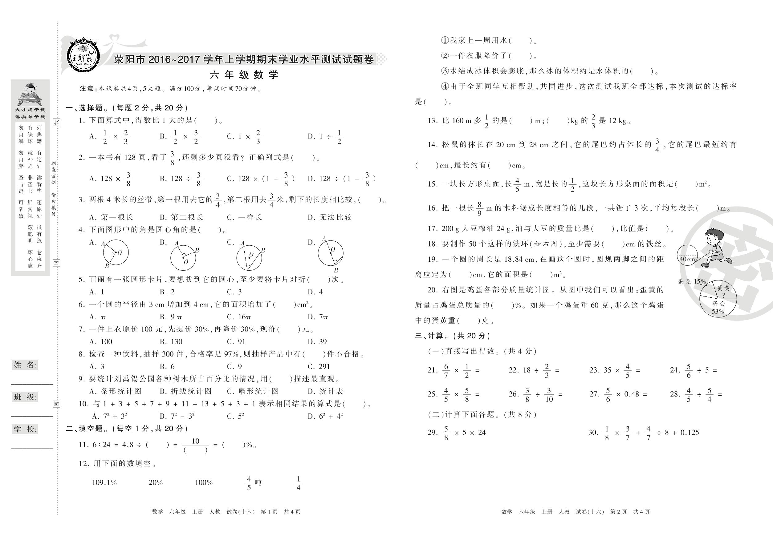 2016-2017学年第一学期荥阳市六年级数学试卷(人教版)【16】