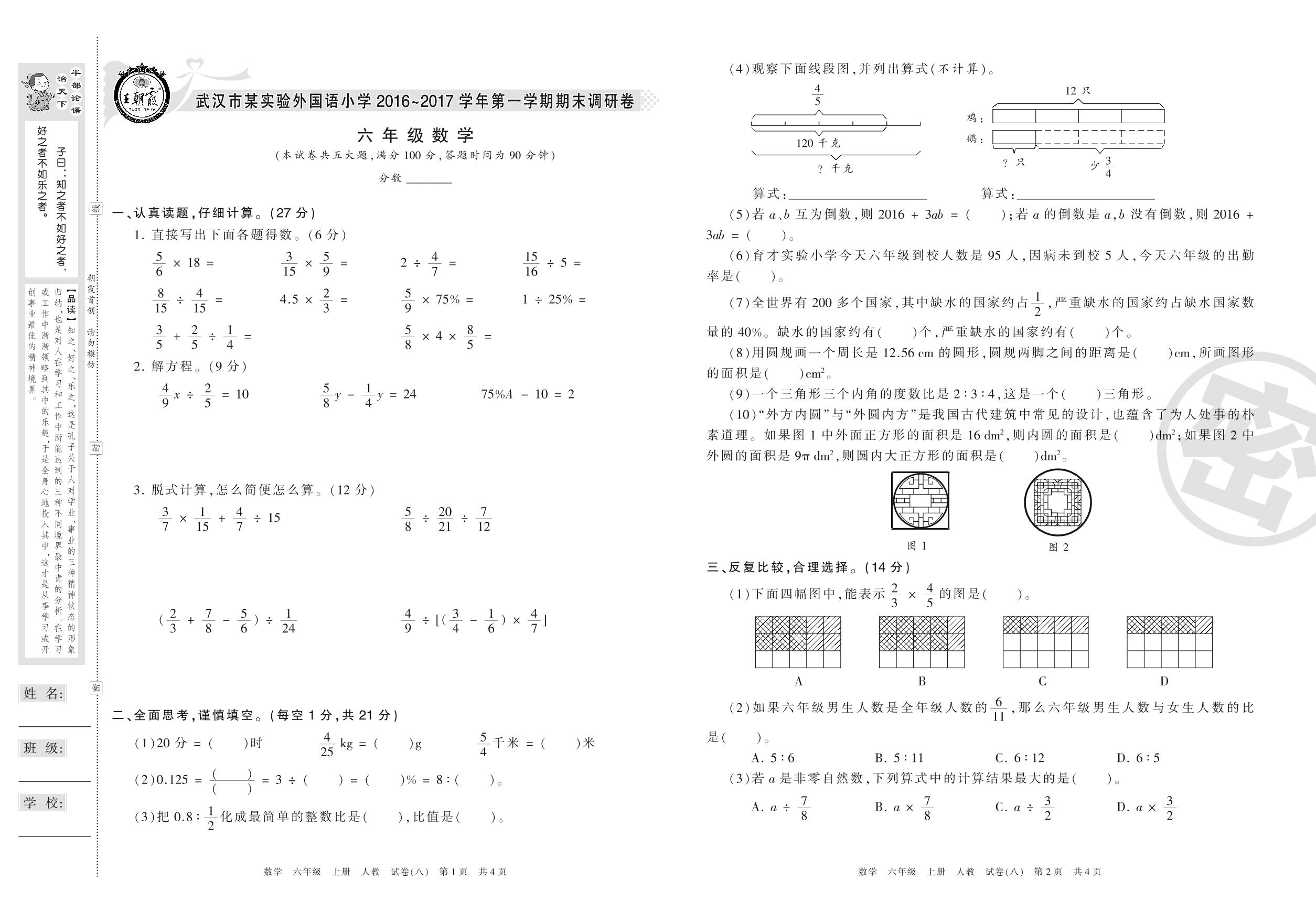 2016-2017学年第一学期武汉市六年级数学试卷(人教版)【8】
