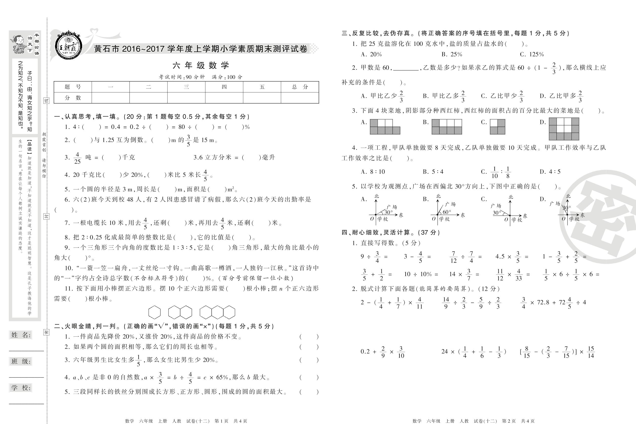 2016-2017学年第一学期黄石市六年级数学试卷(人教版)【12】