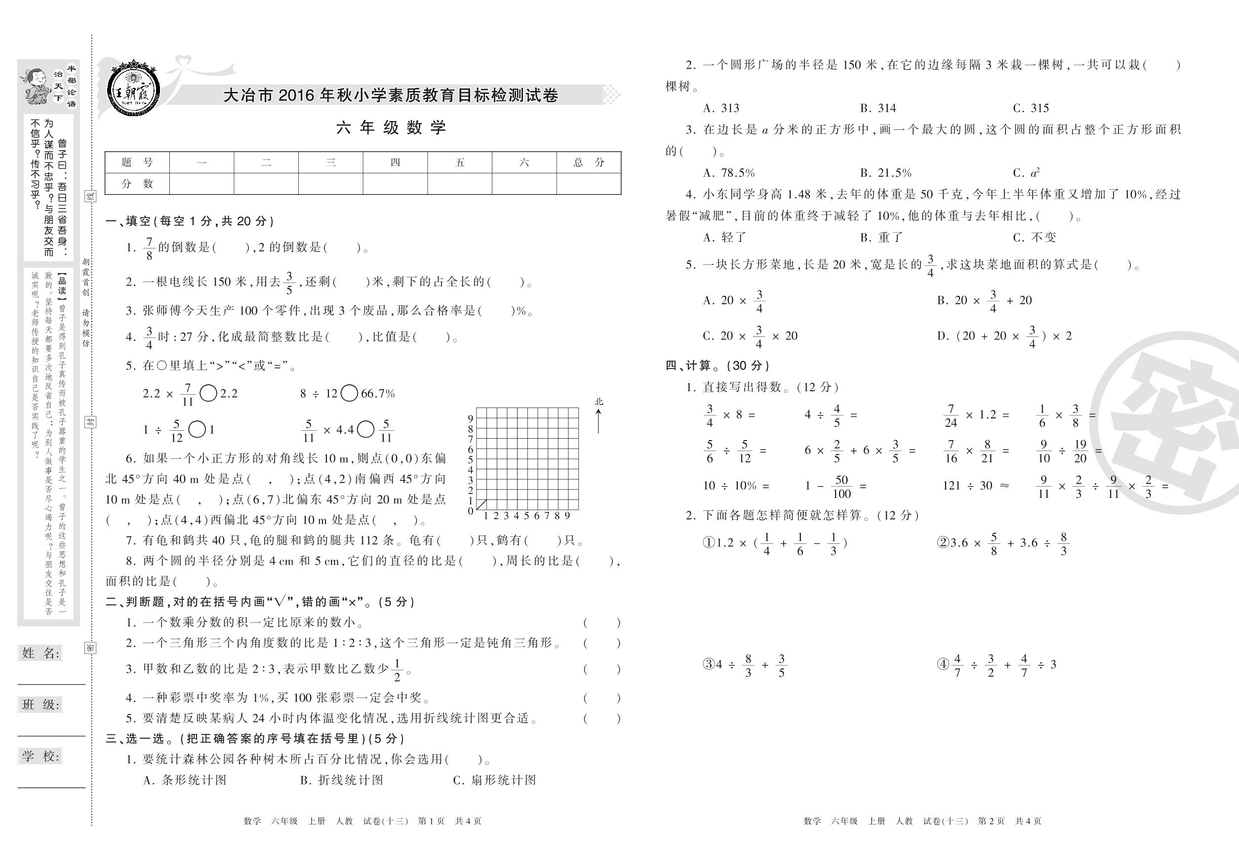 2016-2017学年第一学期大冶市六年级数学试卷(人教版)【13】