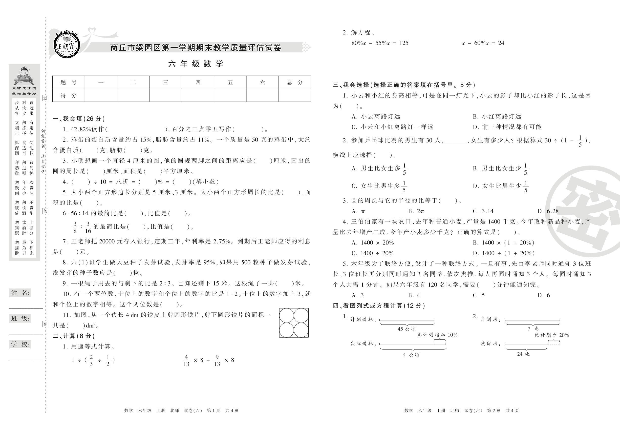 2016-2017学年第一学期商丘市六年级数学试卷(北师版)【6】