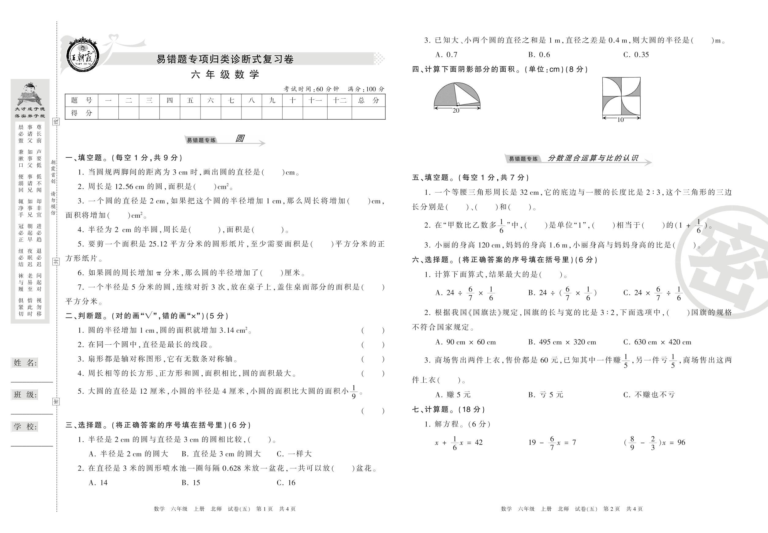六年级数学北师版上册专项卷