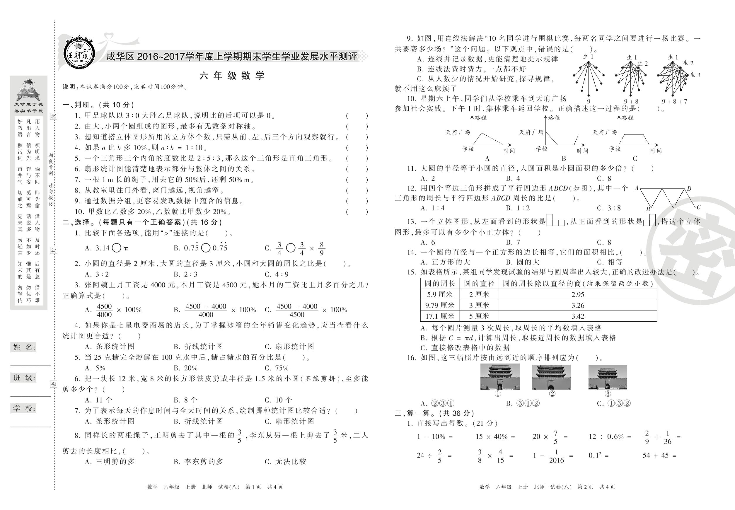 2016-2017学年第一学期成都市成华区六年级数学试卷(北师版)【8】