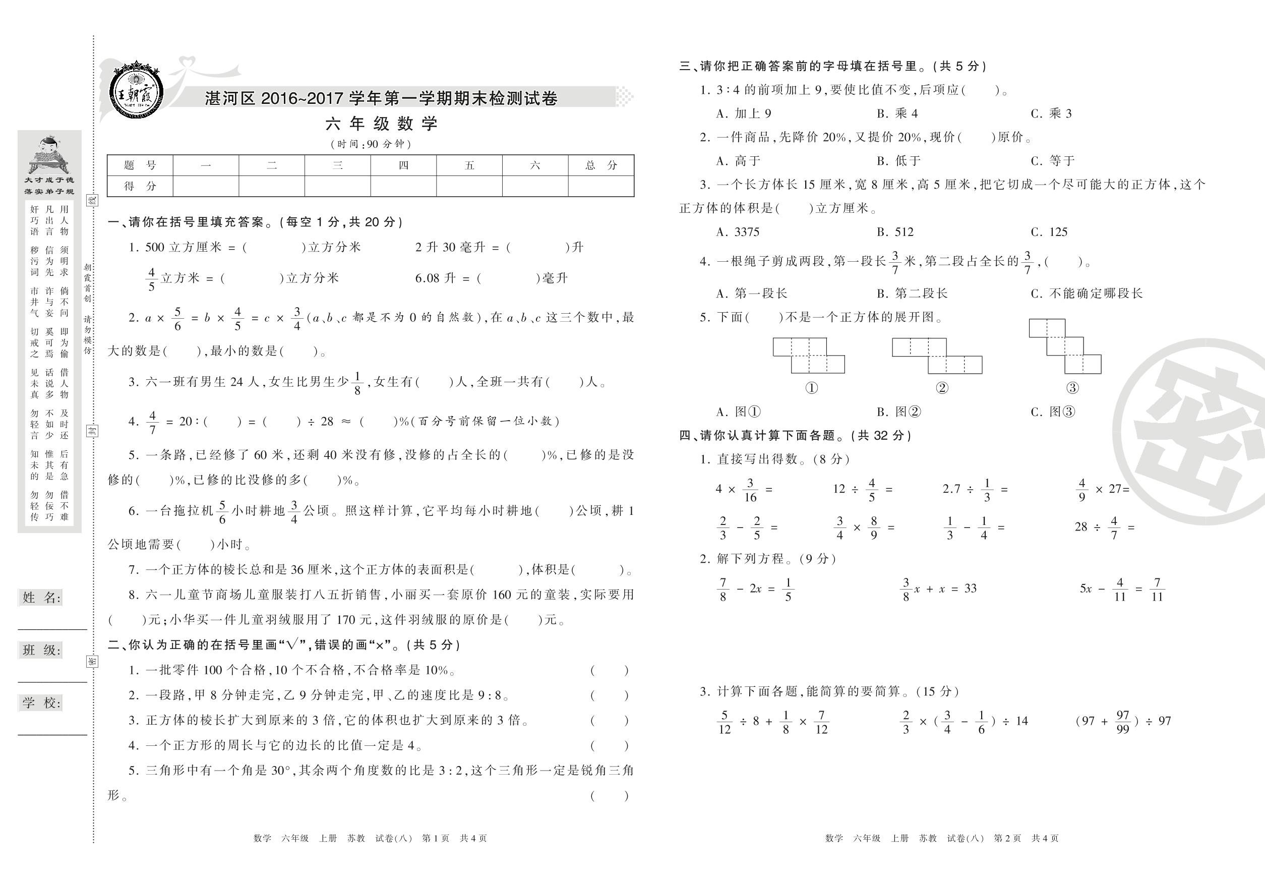 2016-2017学年第一学期平顶山市湛河区六年级数学试卷(苏教版)【8】