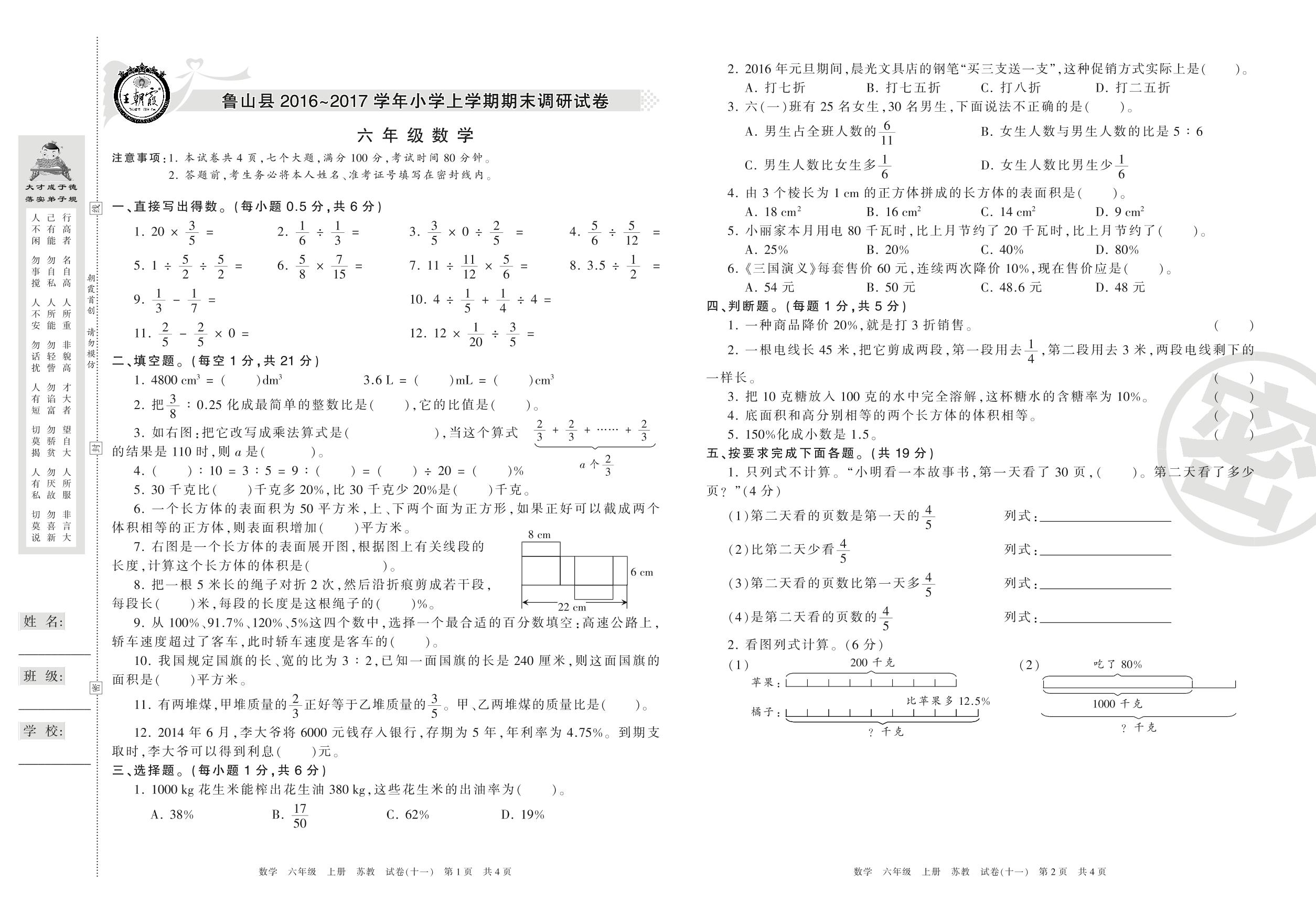 2016-2017学年第一学期平顶山市鲁山县六年级数学试卷(苏教版)【11】