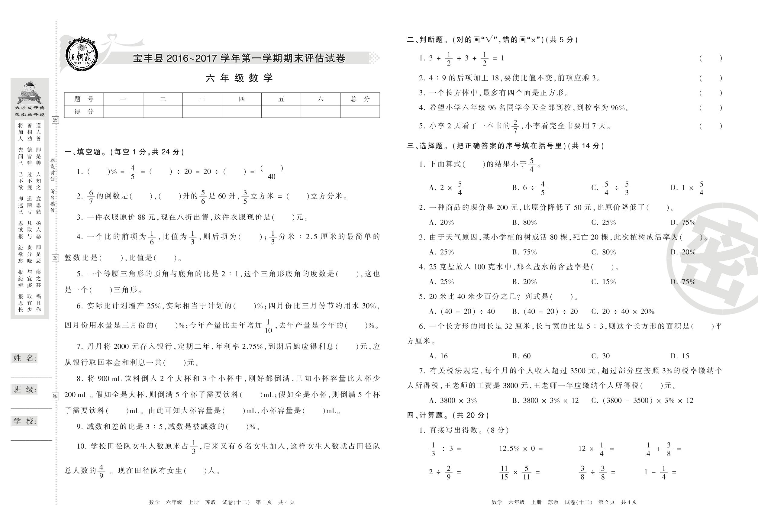 2016-2017学年第一学期平顶山市宝丰县六年级数学试卷(苏教版)【12】