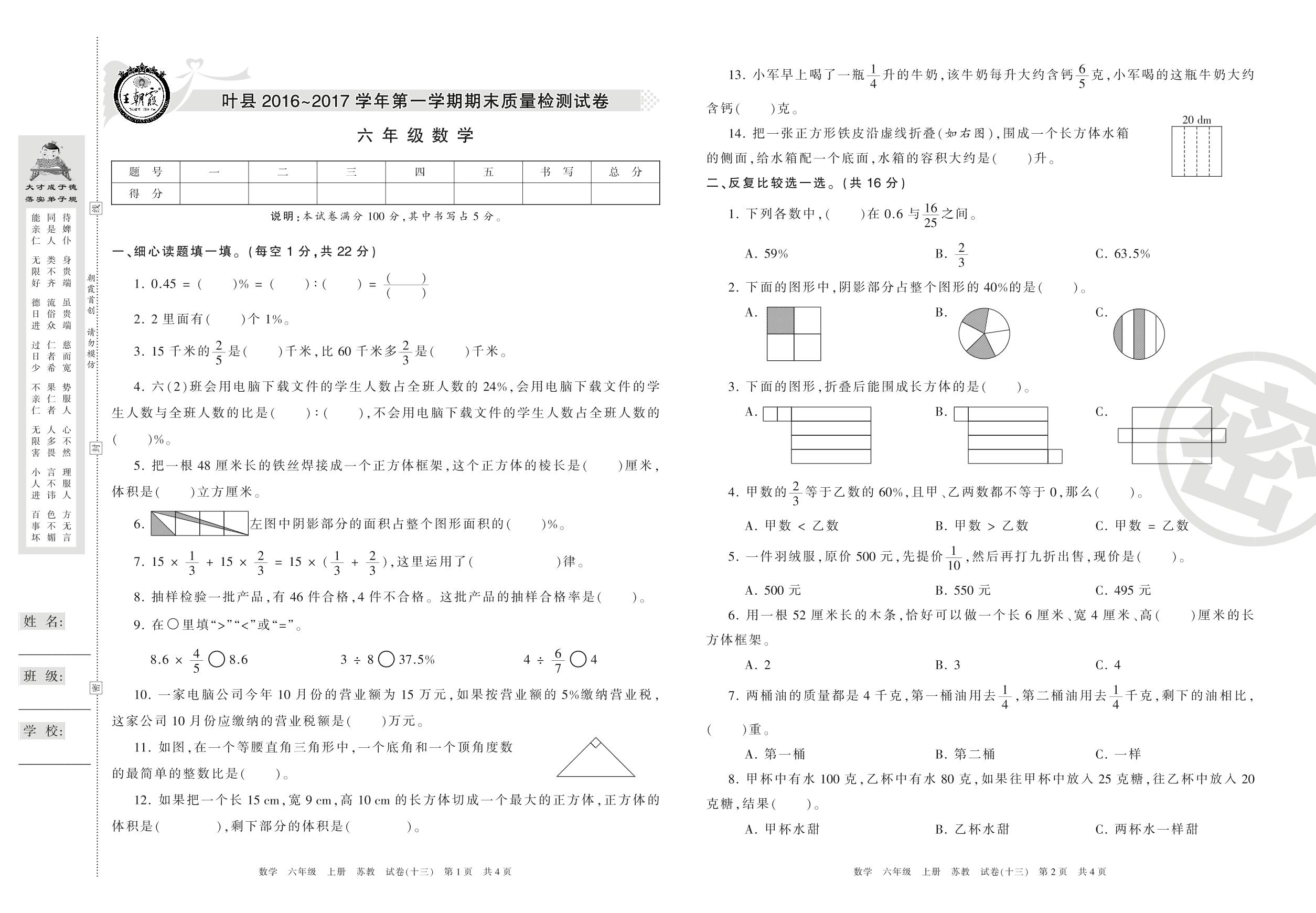 2016-2017学年第一学期平顶山市叶县六年级数学试卷(苏教版)【13】