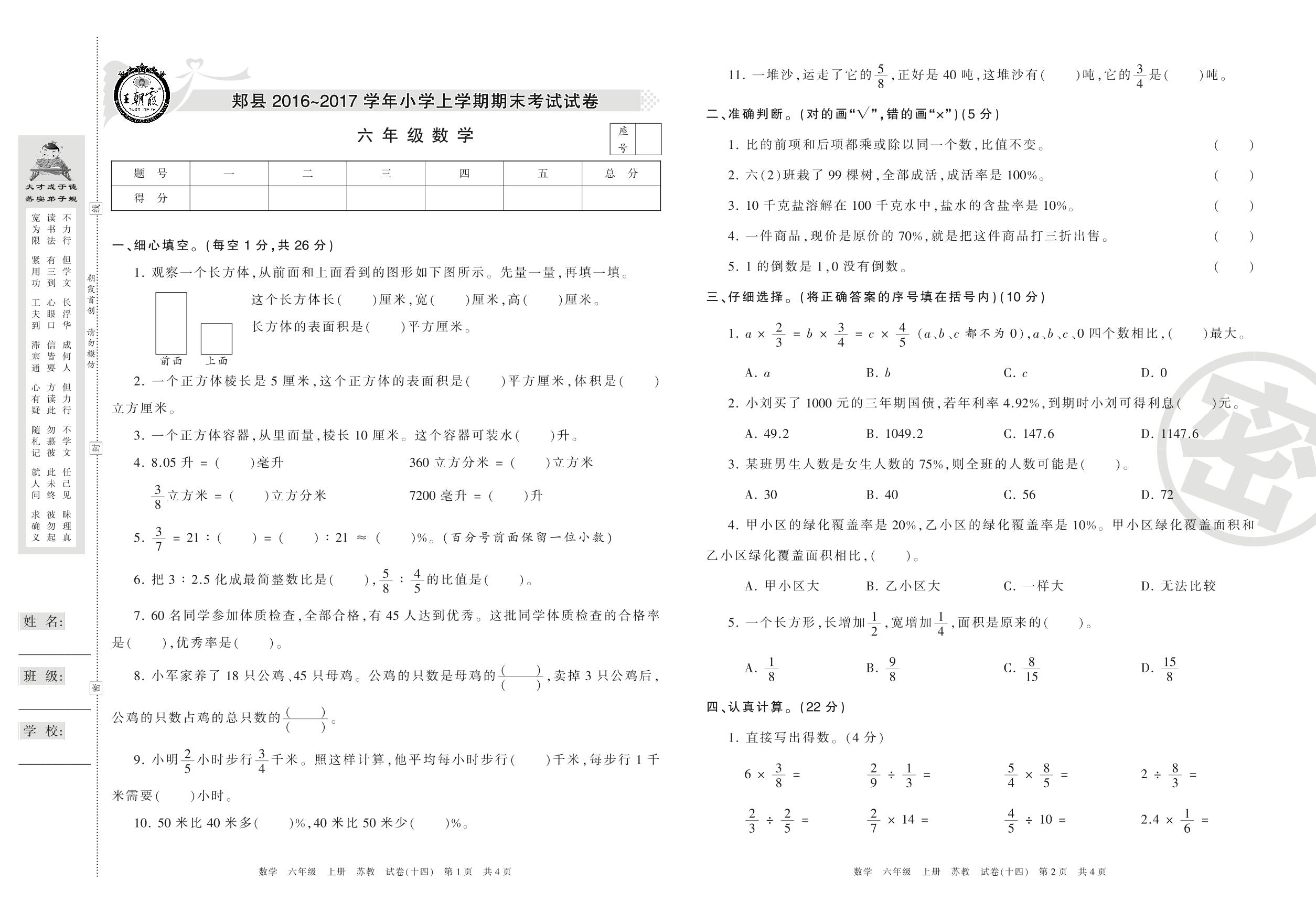 2016-2017学年第一学期平顶山市郏县六年级数学试卷(苏教版)【14】