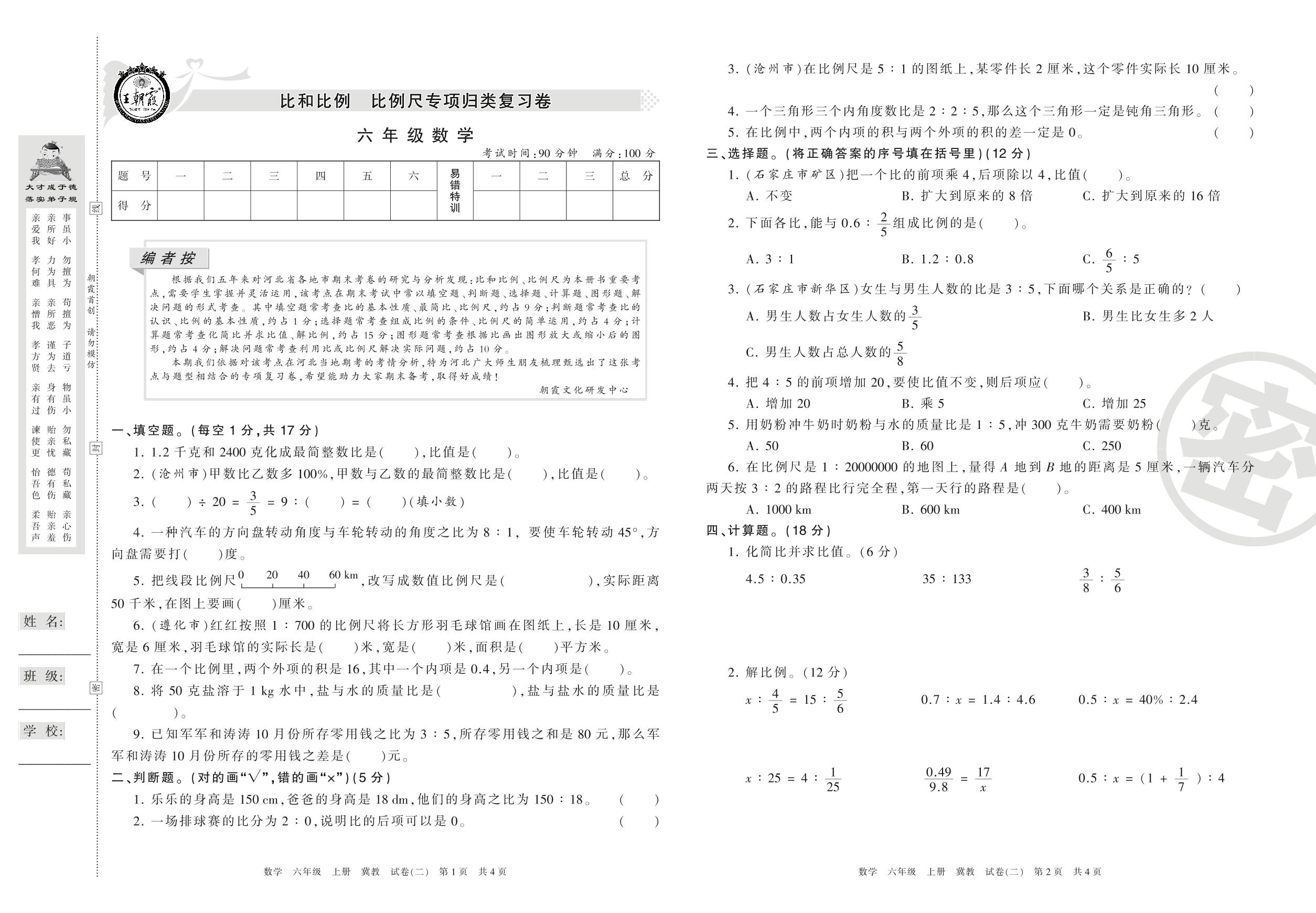 王朝霞期末专项卷六年级上册数学(冀教版)【2】