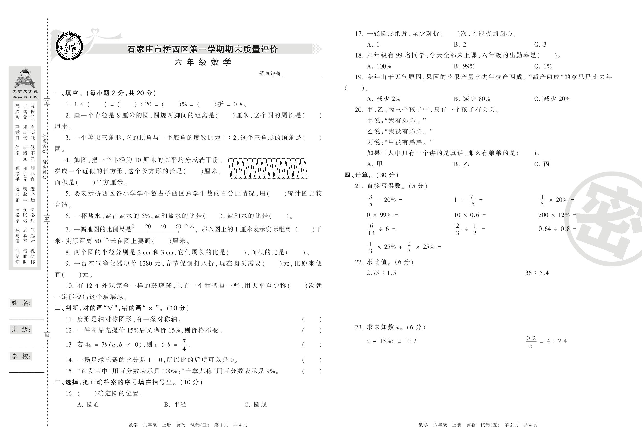 2016-2017学年第一学期石家庄市桥西区六年级数学试卷(冀教版)【5】