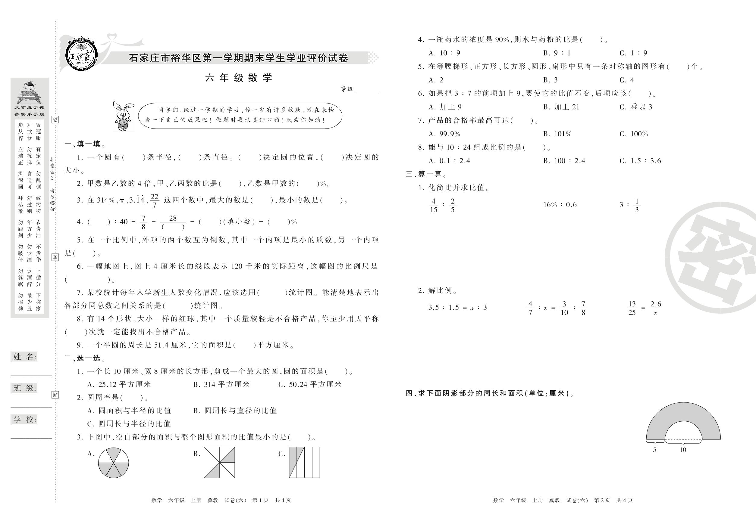 六年级数学冀教版上册期末卷