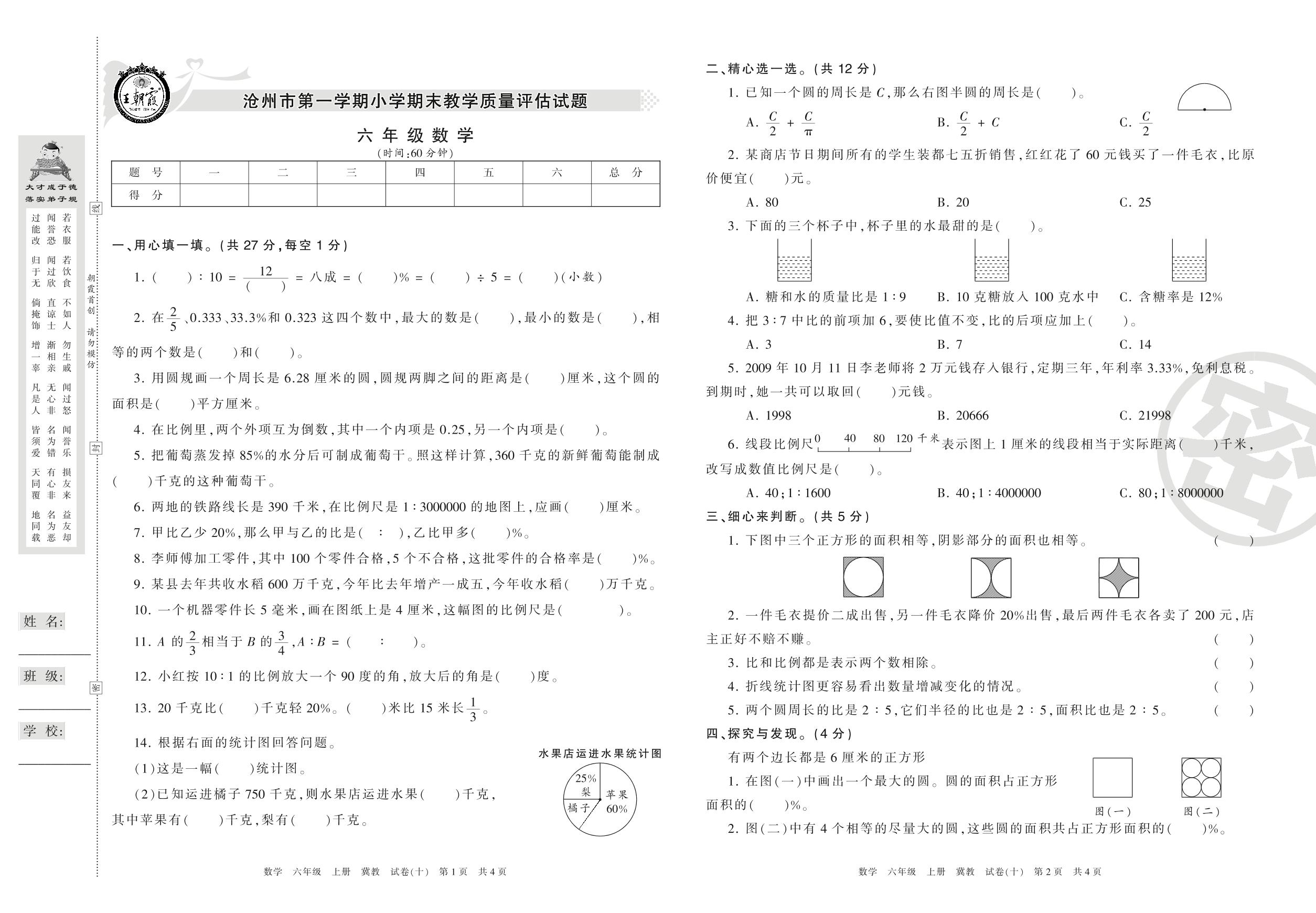 2016-2017学年第一学期沧州市六年级数学试卷(冀教版)【10】