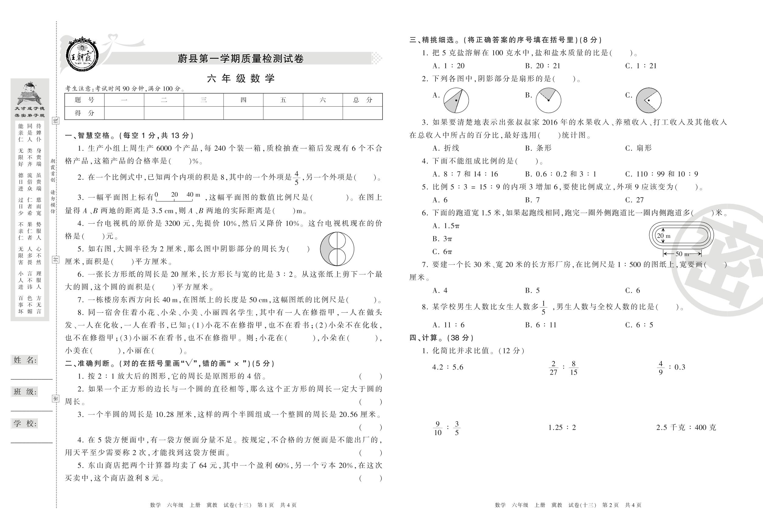 2016-2017学年第一学期张家口市蔚县六年级数学试卷(冀教版)【13】