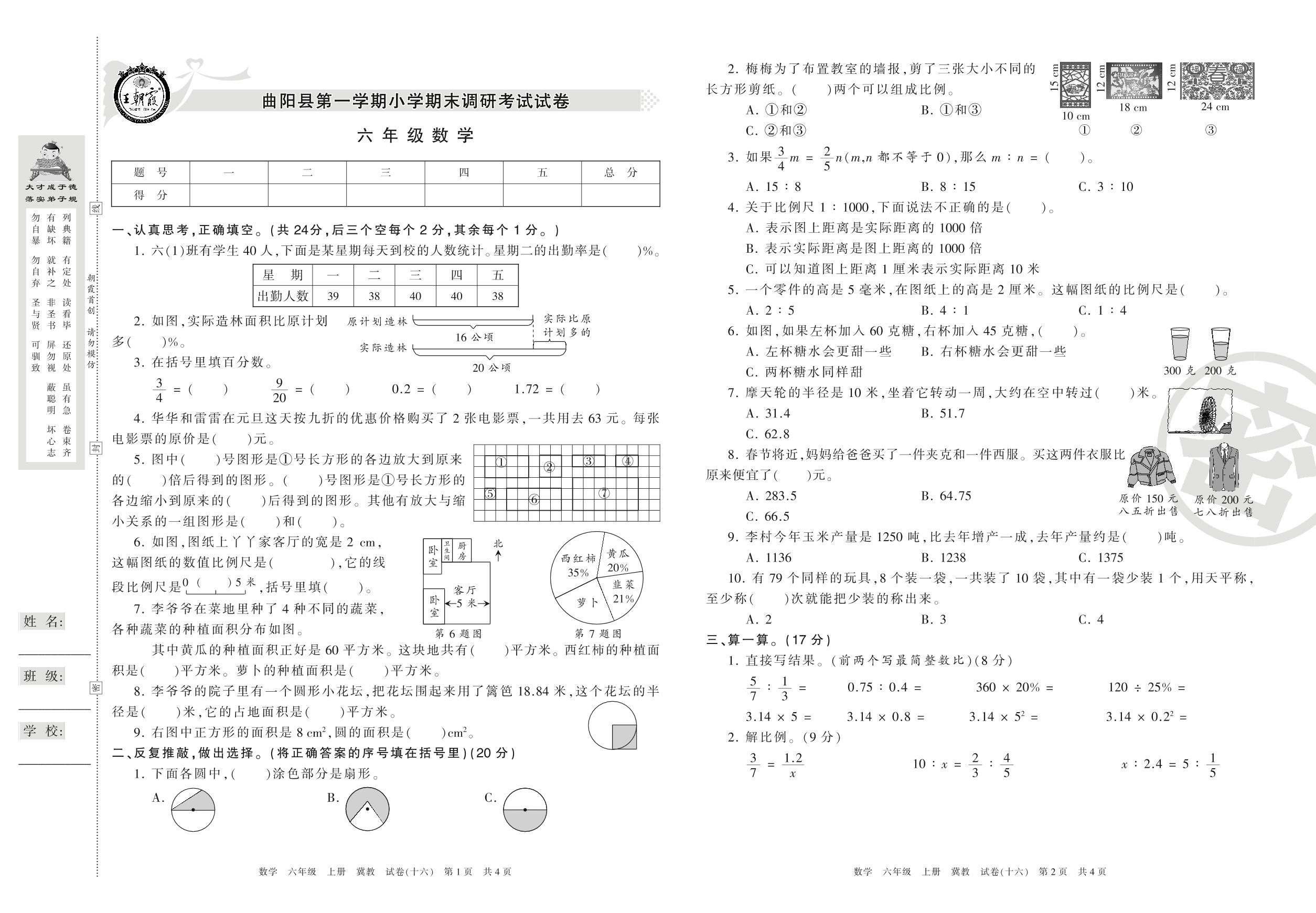 2016-2017学年第一学期保定市曲阳县六年级数学试卷(冀教版)【16】
