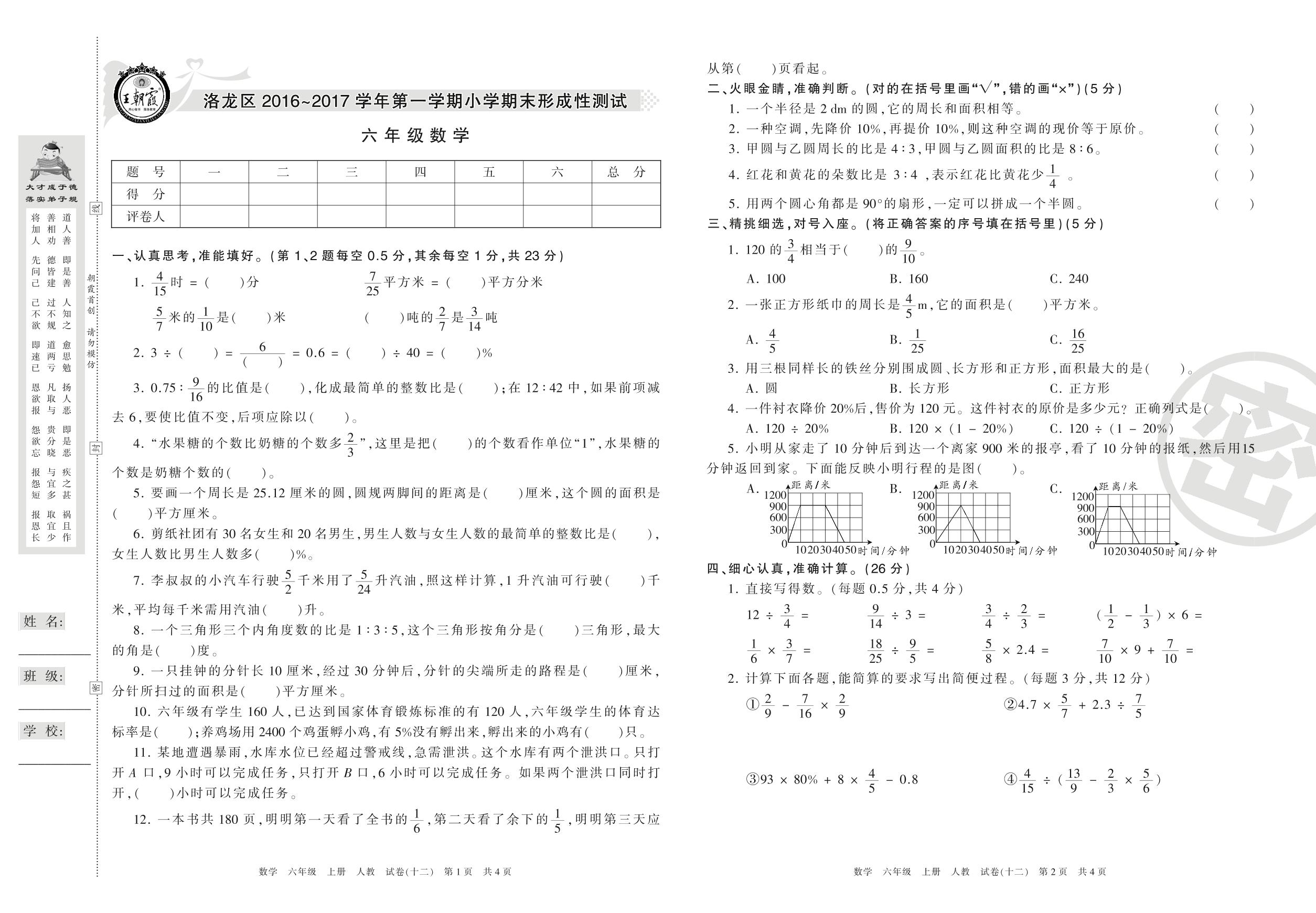2016-2017学年第一学期洛阳市洛龙区六年级数学试卷(人教版)【12】