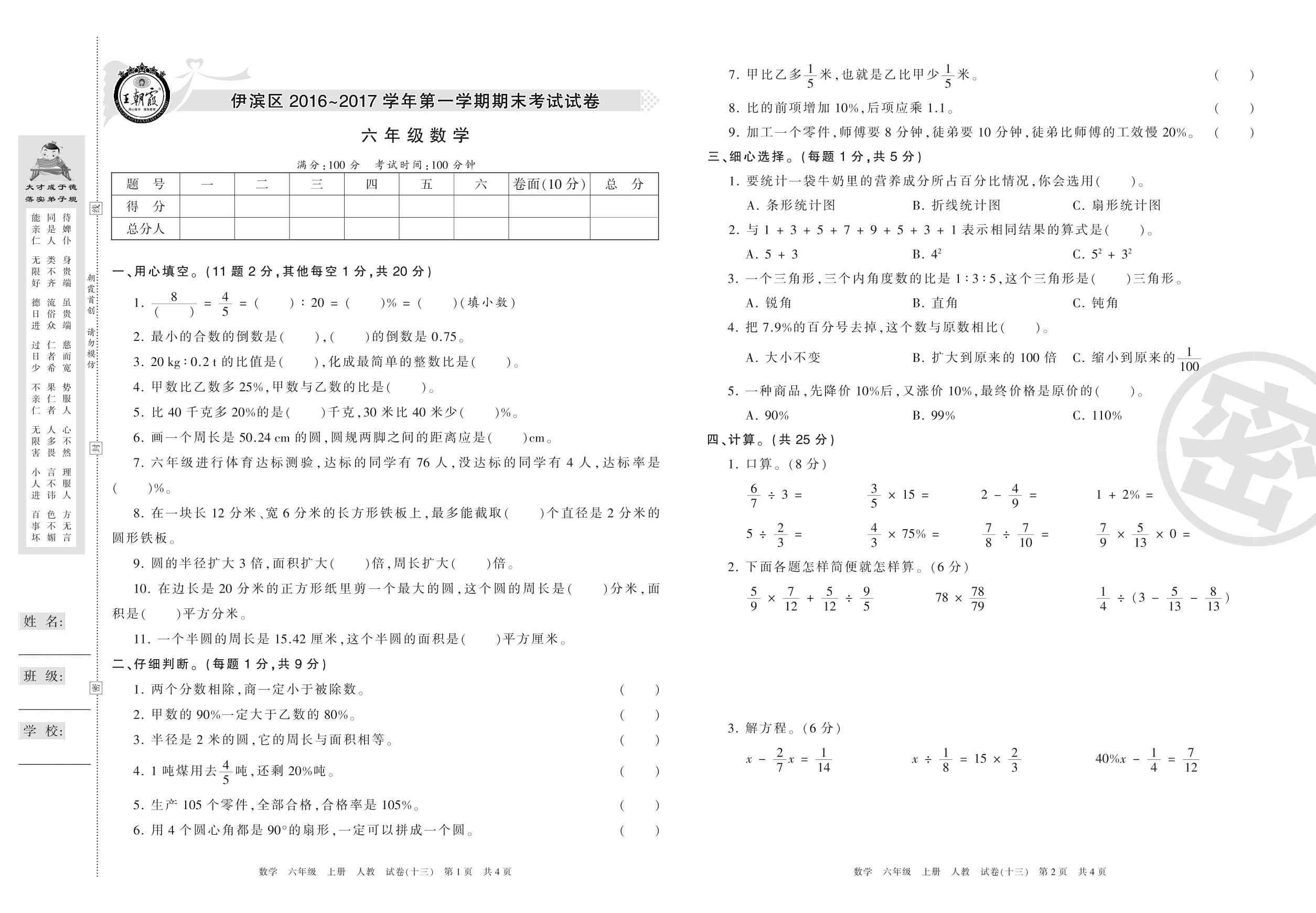 2016-2017学年第一学期洛阳市伊滨区六年级数学试卷(人教版)【13】