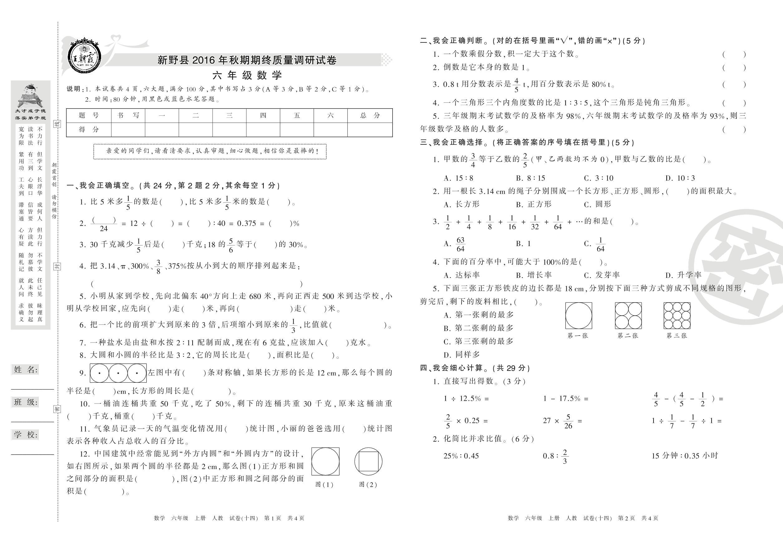 2016-2017学年第一学期南阳市新野县六年级数学试卷(人教版)【14】