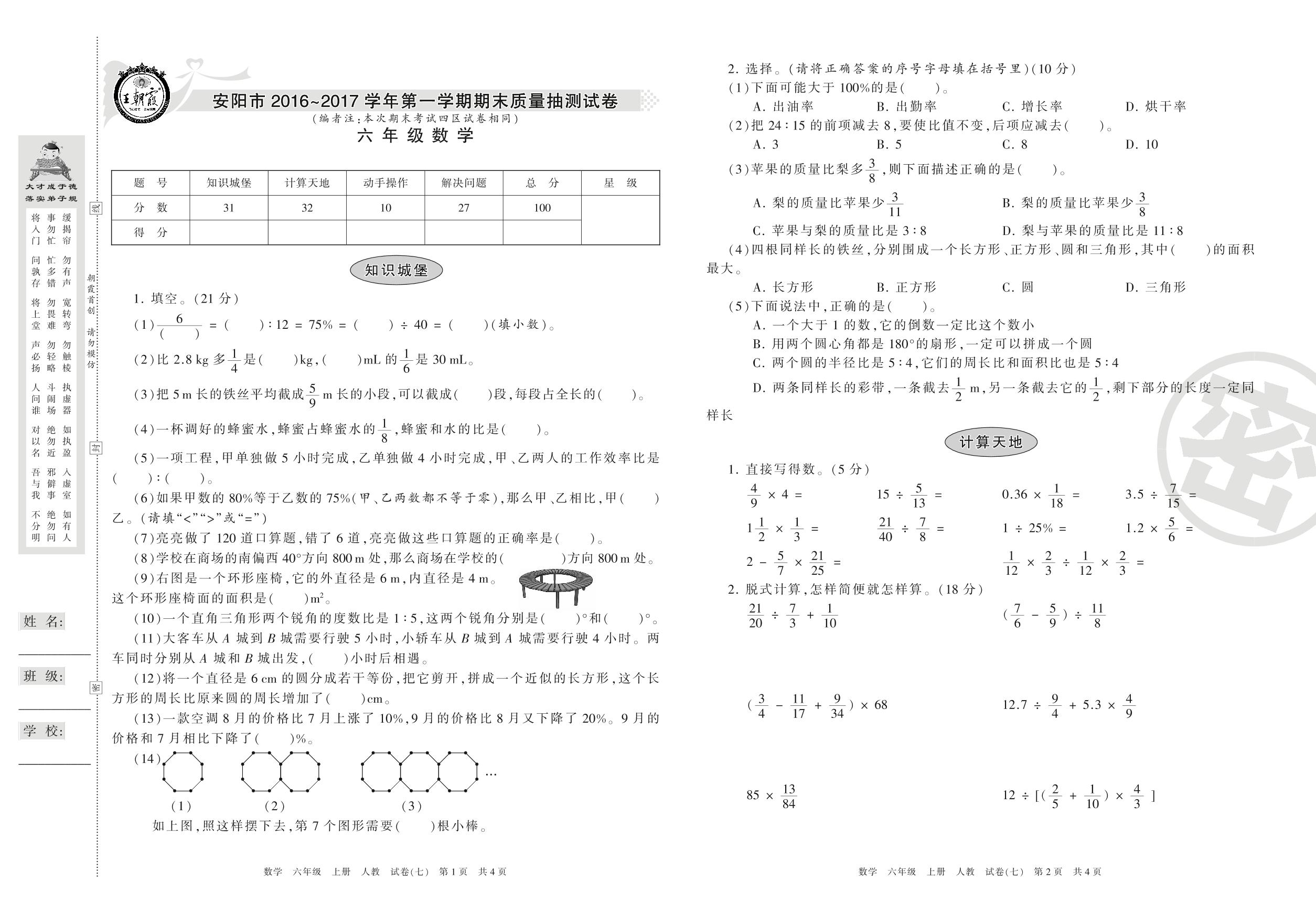2016-2017学年第一学期安阳市六年级数学试卷(人教版)【7】