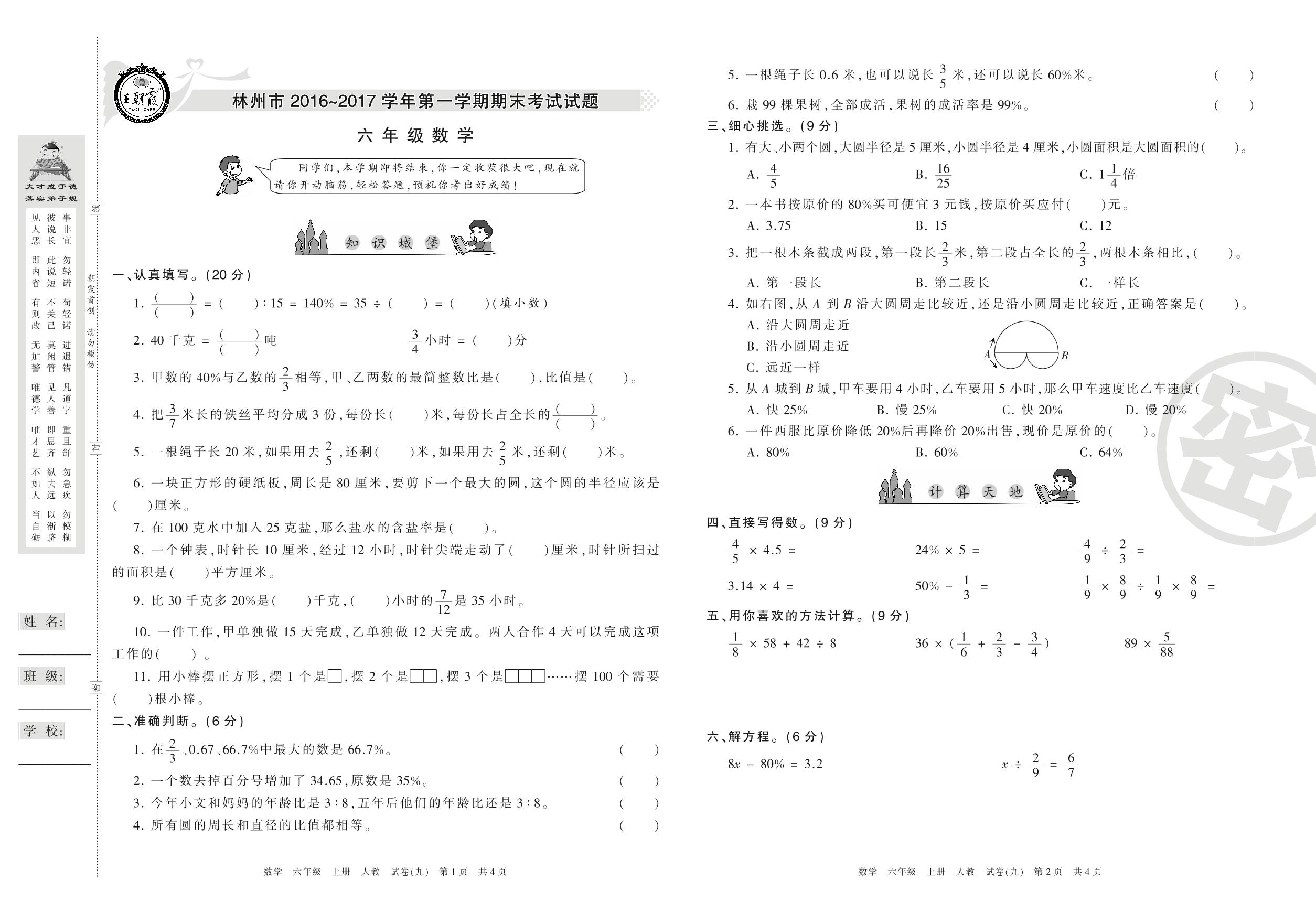 2016-2017学年第一学期林州市六年级数学试卷(人教版)【9】