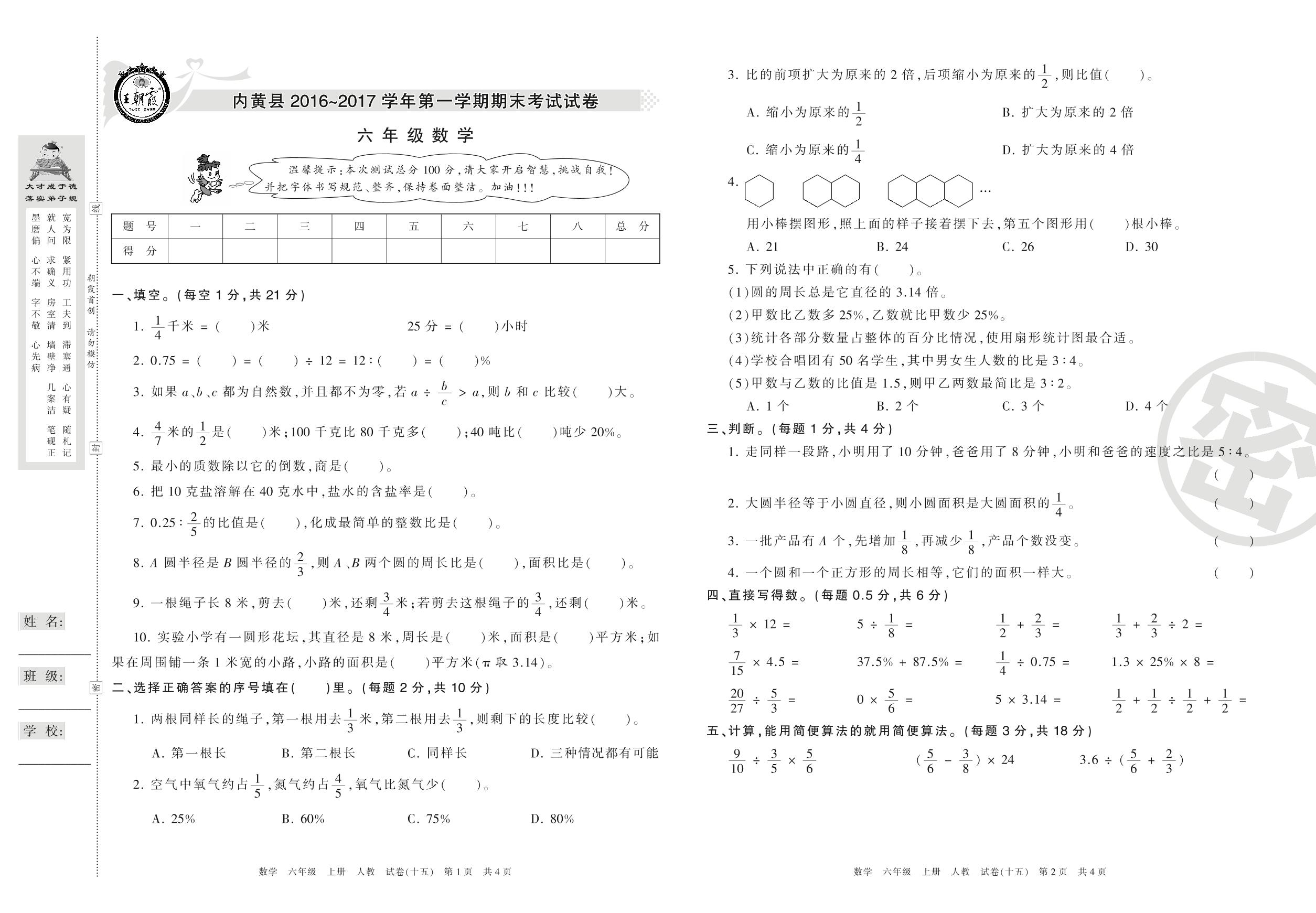 2016-2017学年第一学期安阳市内黄县六年级数学试卷(人教版)【15】