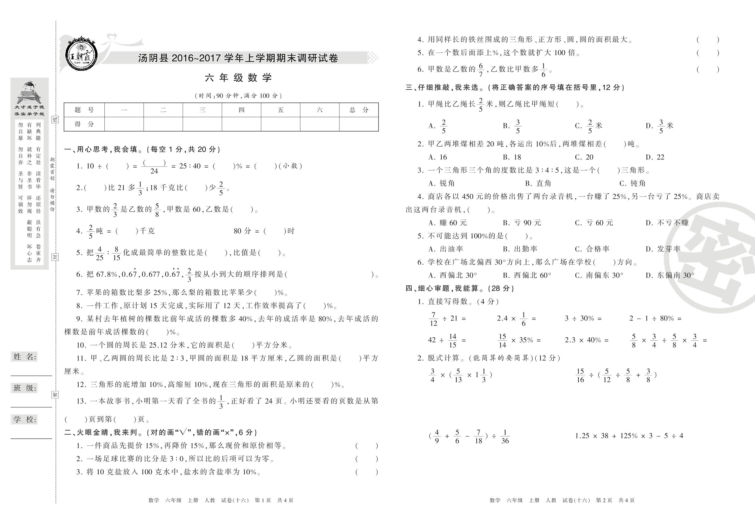 2016-2017学年第一学期安阳市汤阴县六年级数学试卷(人教版)【16】