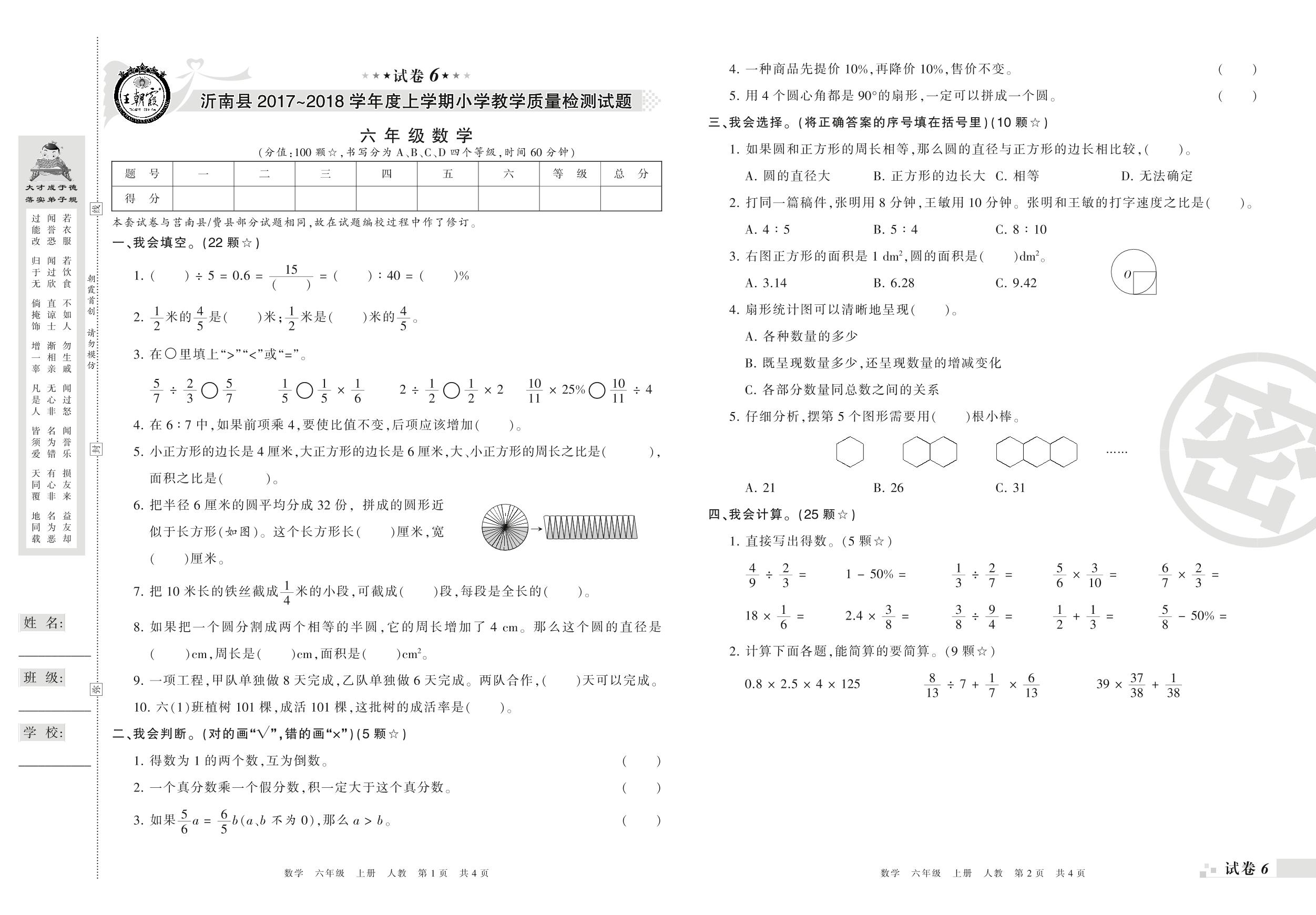 2017-2018学年第一学期临沂市沂南县六年级数学试卷(人教版)【6】
