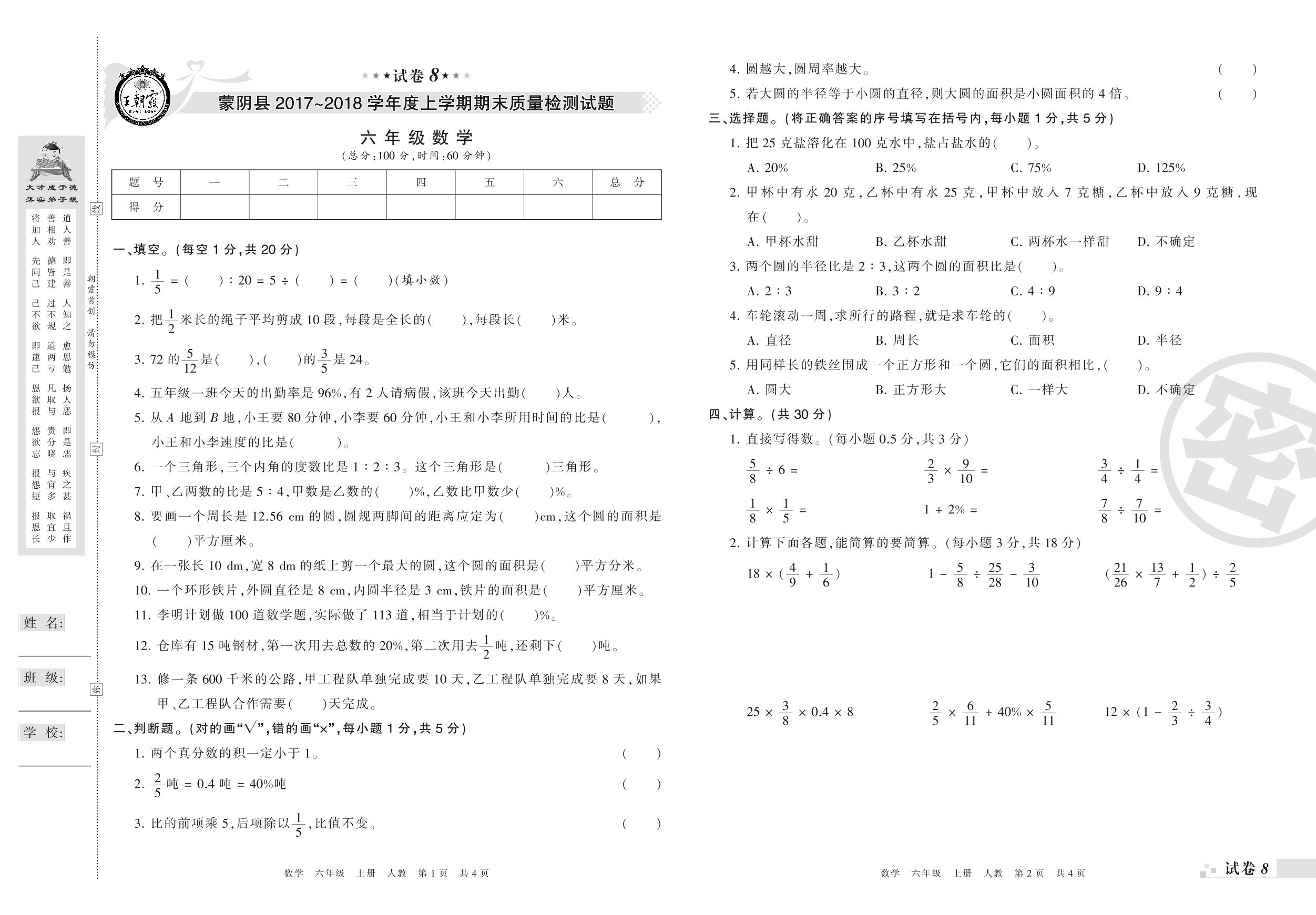 2017-2018学年第一学期临沂市蒙阴县六年级数学试卷(人教版)【8】