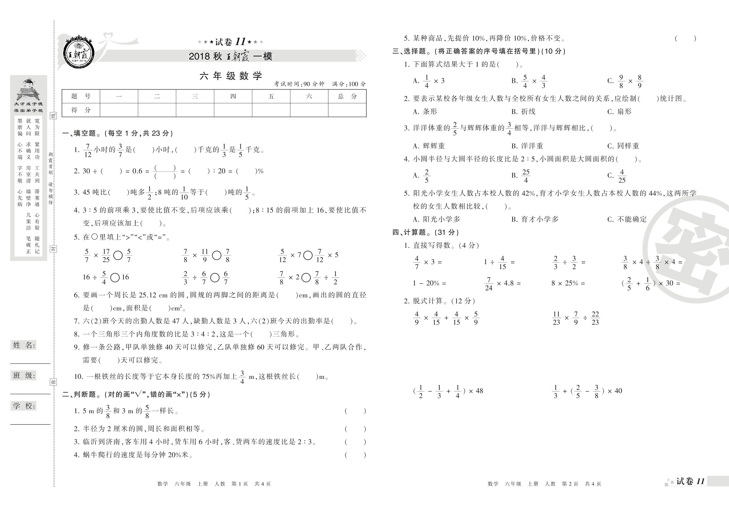 王朝霞期末模拟卷六年级上册数学(人教版)_R210805105525【11】
