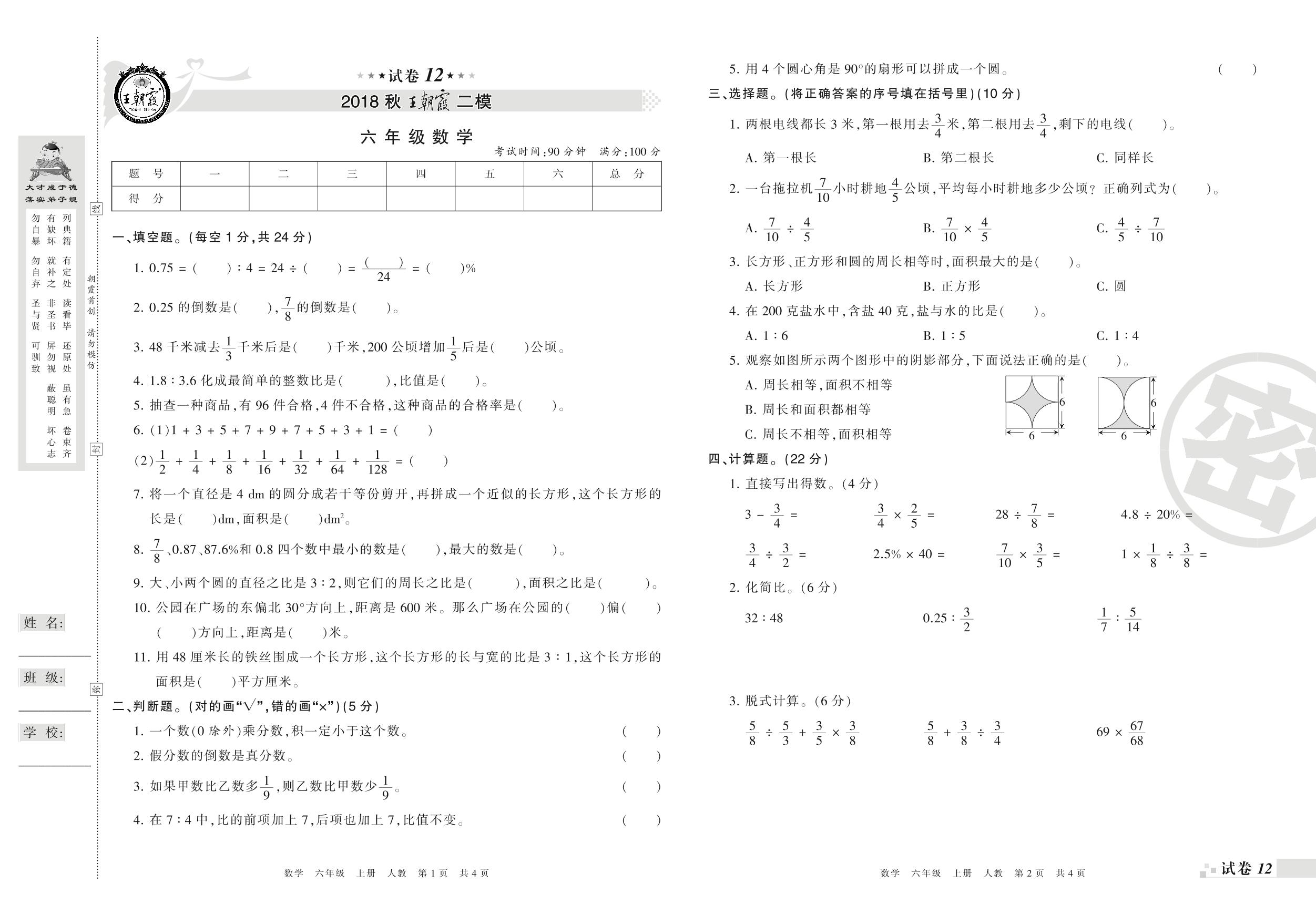 王朝霞期末模拟卷六年级上册数学(人教版)【12】