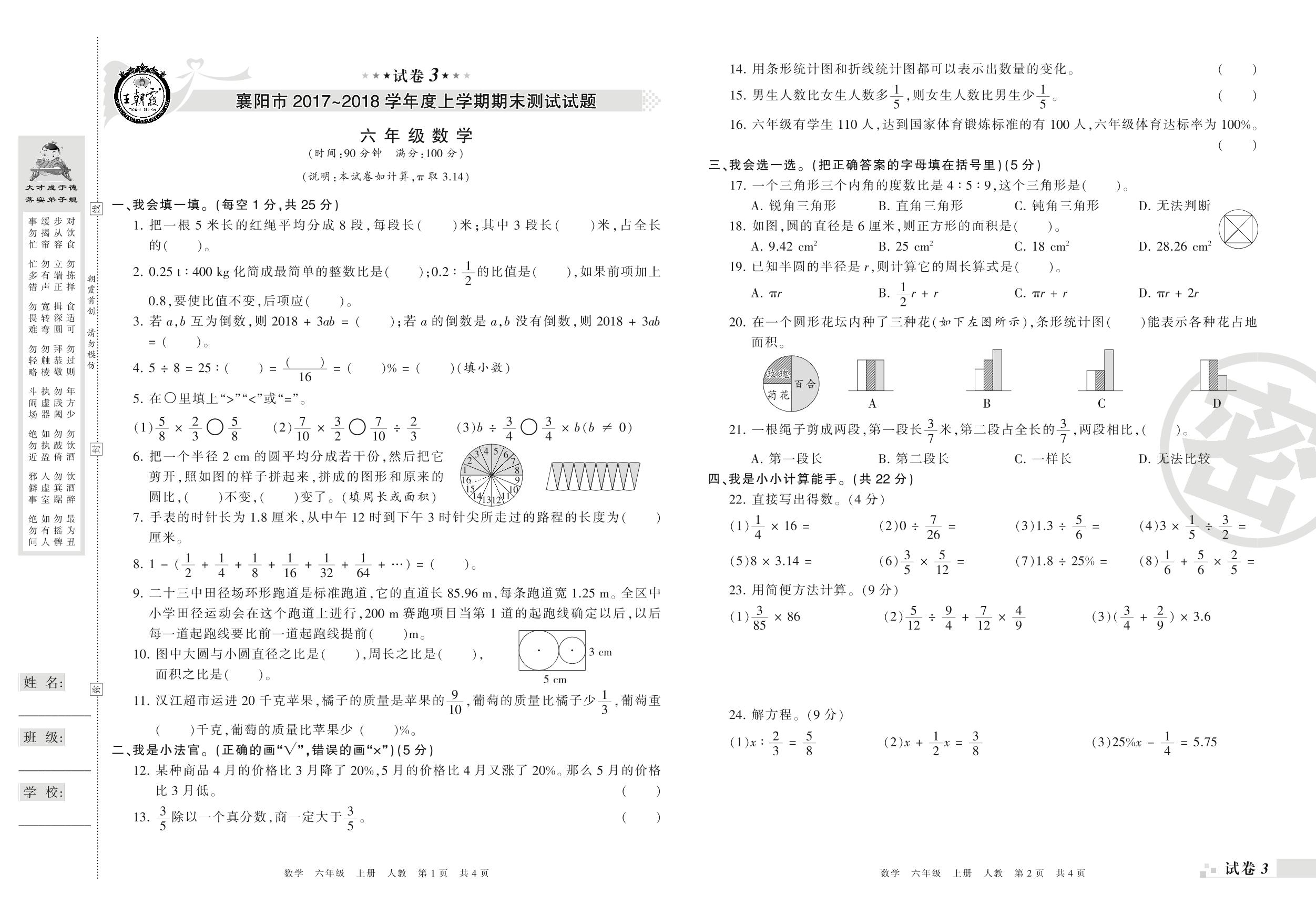 2017-2018学年第一学期襄阳市六年级数学试卷(人教版)【3】