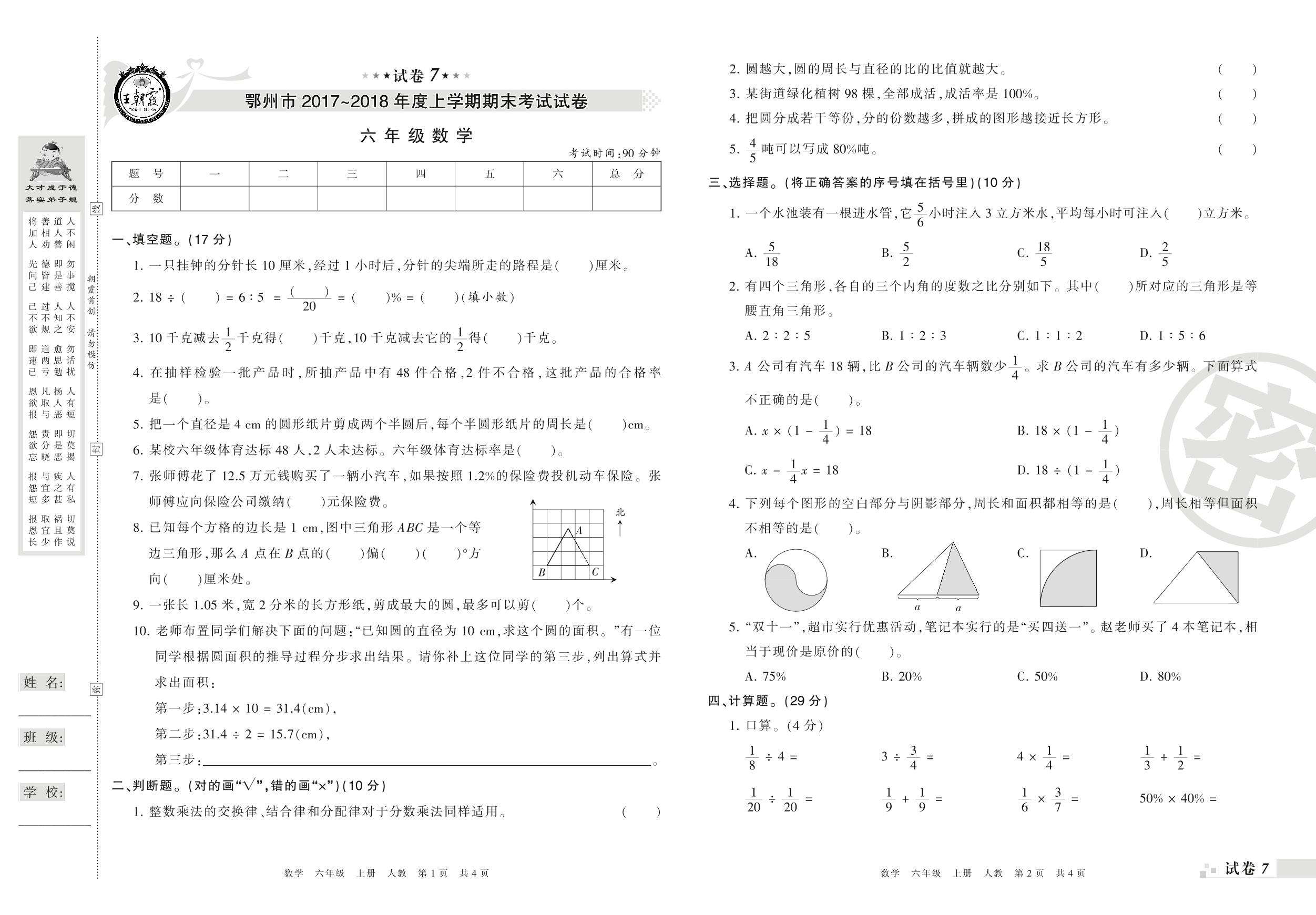 2017-2018学年第一学期鄂州市六年级数学试卷(人教版)【7】
