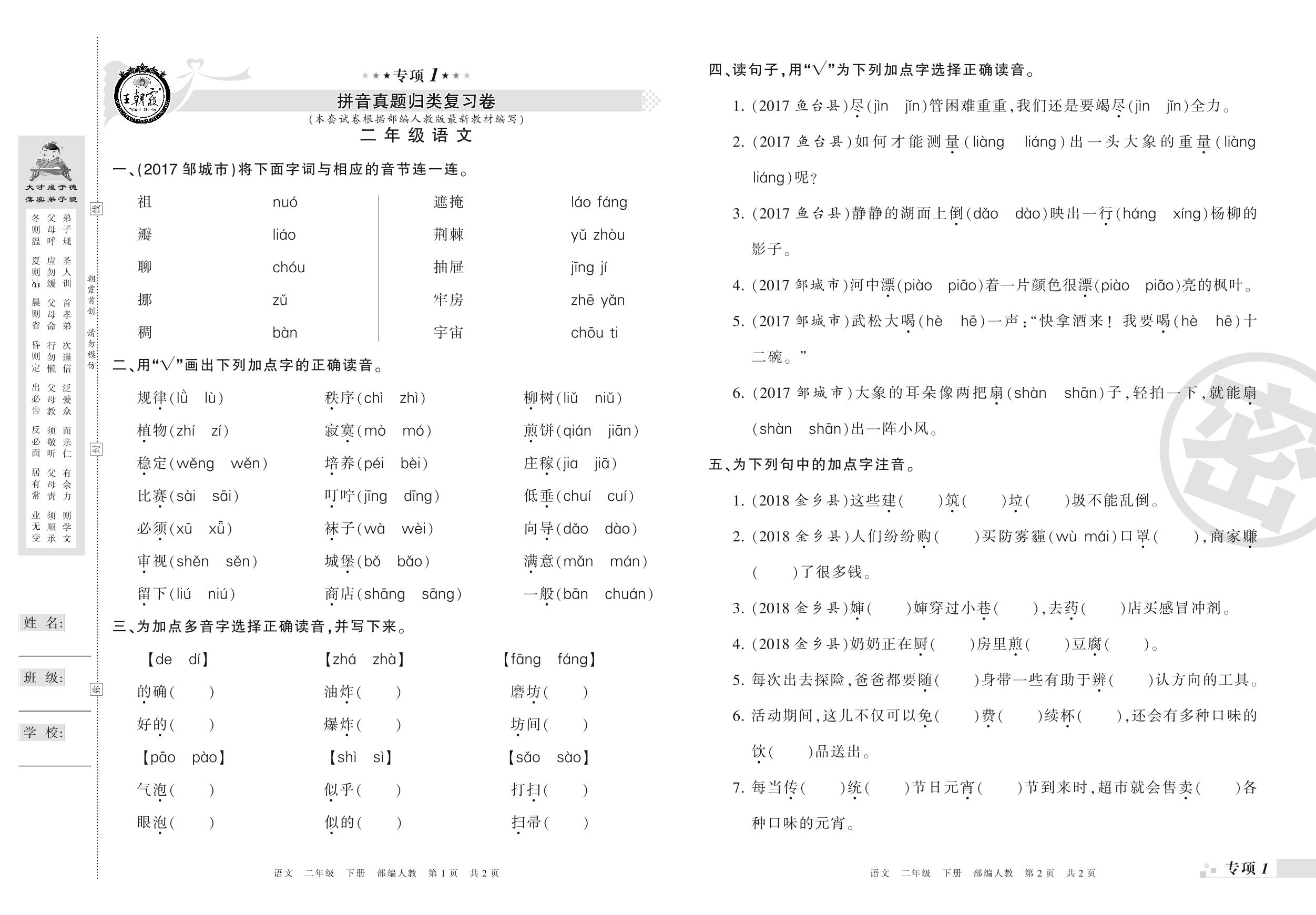 王朝霞期末专项卷——拼音、汉字真题归类复习二年级下册语文(人教版)_R21080173021【0】