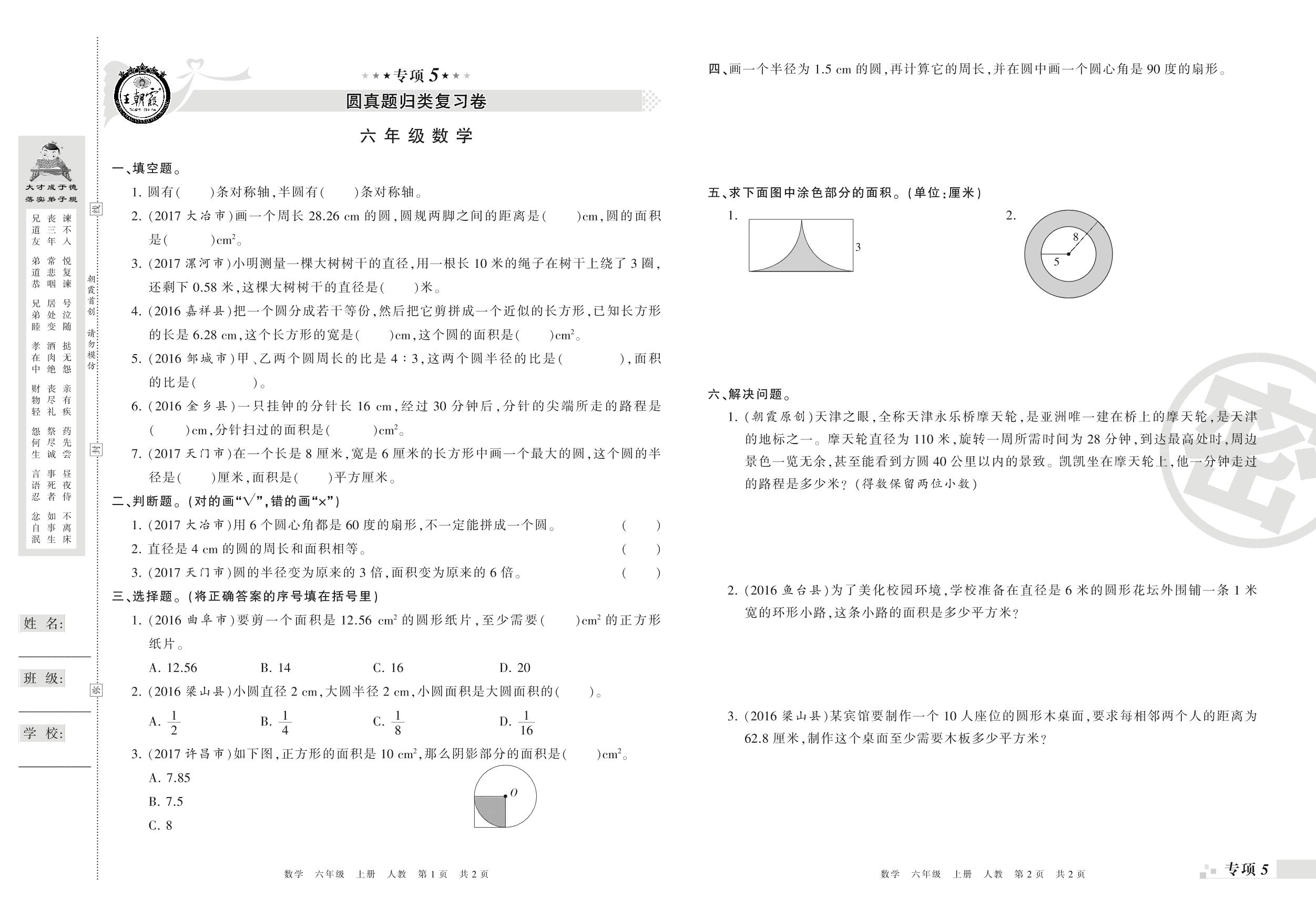 王朝霞期末专项卷——圆、百分数(一)真题归类复习卷六年级上册数学(人教版)_R210805105627【0】