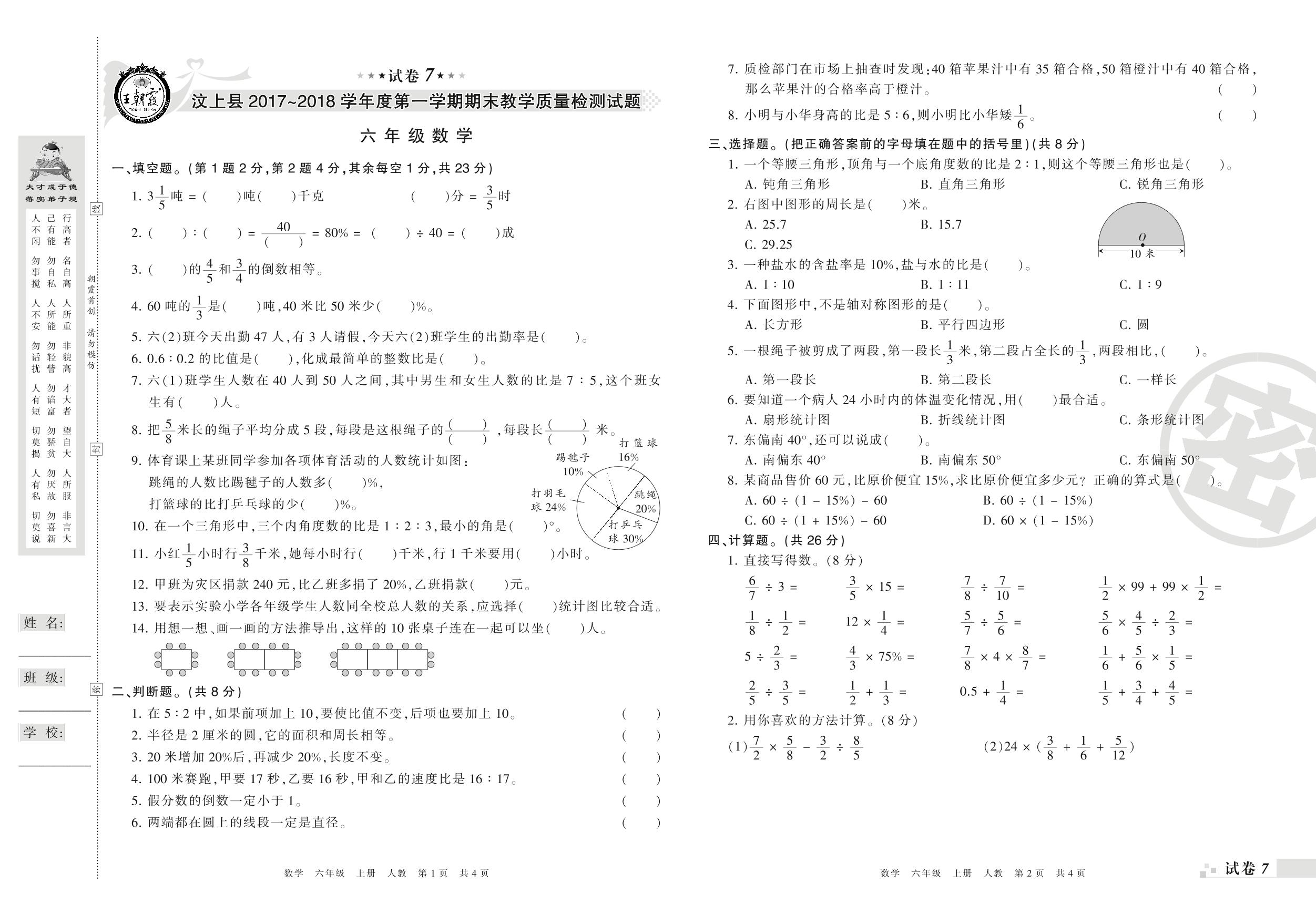 2017-2018学年第一学期济宁市汶上县六年级数学试卷(人教版)【7】