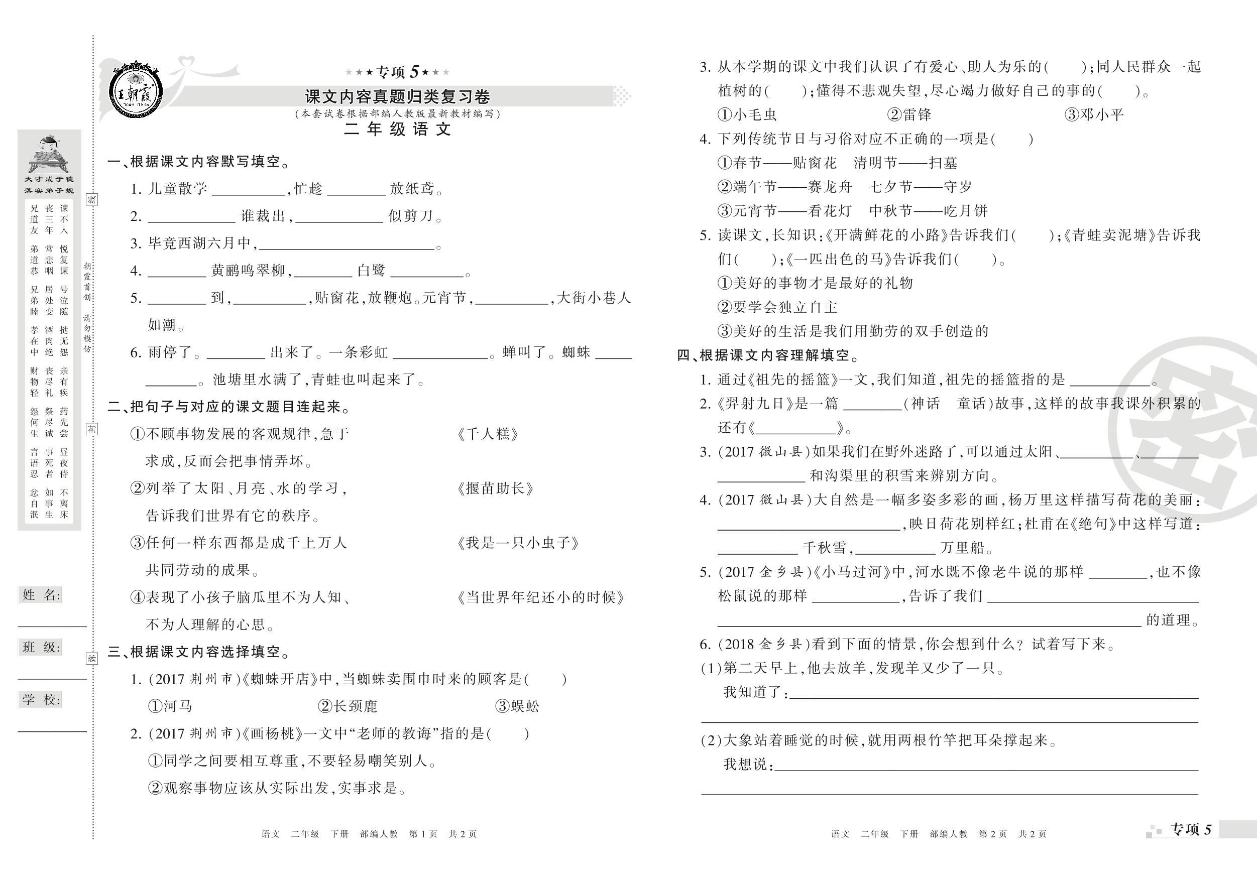 王朝霞期末专项卷——课文内容、积累运用真题归类复习二年级下册语文(人教版)_R21080173030【0】