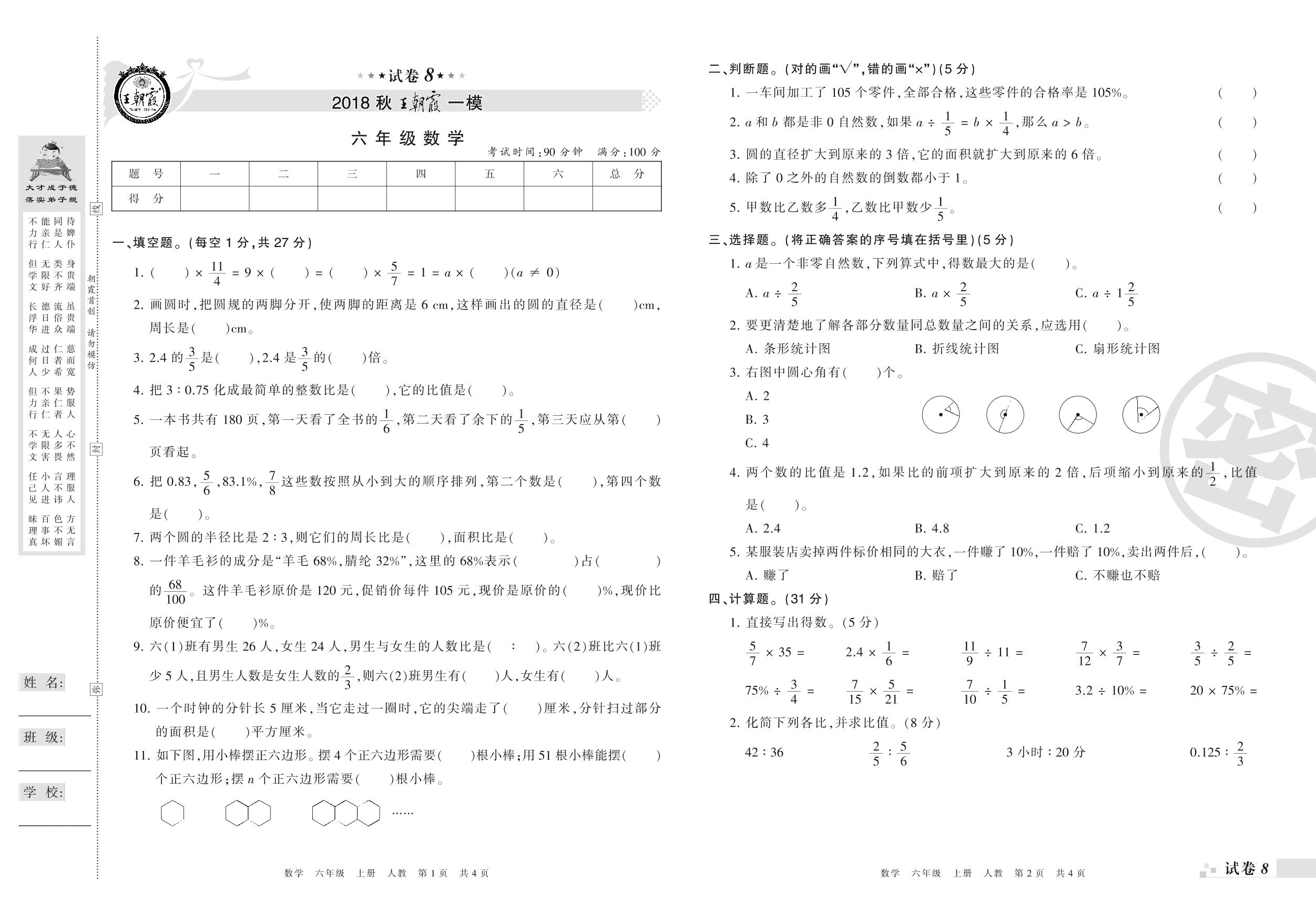 王朝霞期末模拟卷六年级上册数学(人教版)_R210805105916【8】