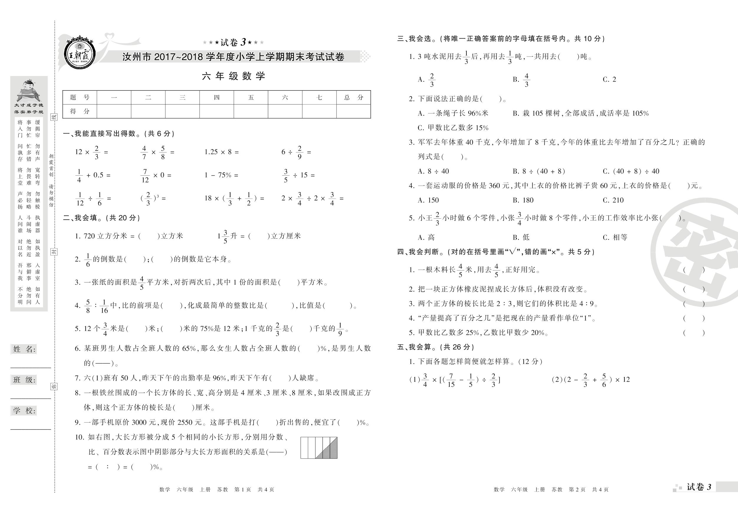 2017-2018学年第一学期汝州市六年级数学试卷(苏教版)【3】