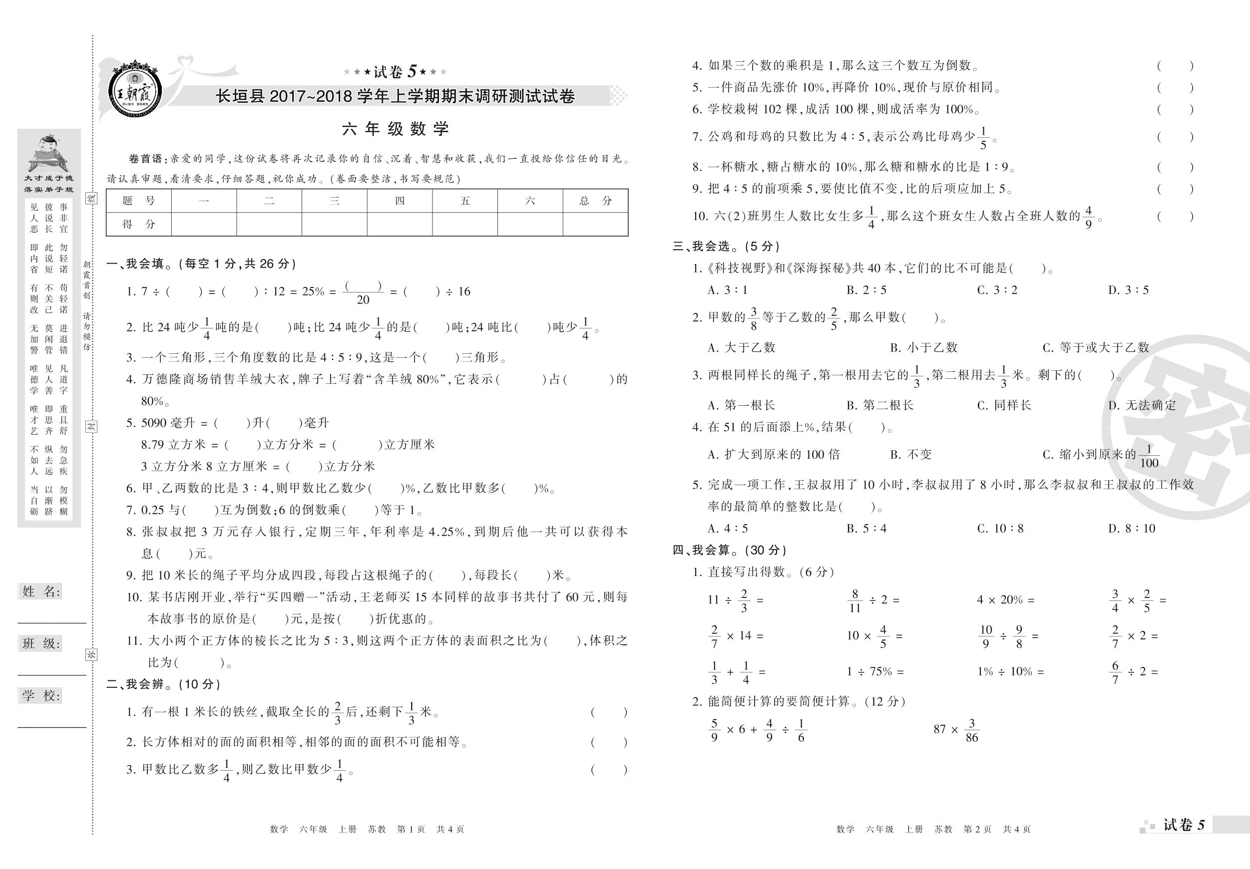 2017-2018学年第一学期新乡市长垣县六年级数学试卷(苏教版)【5】