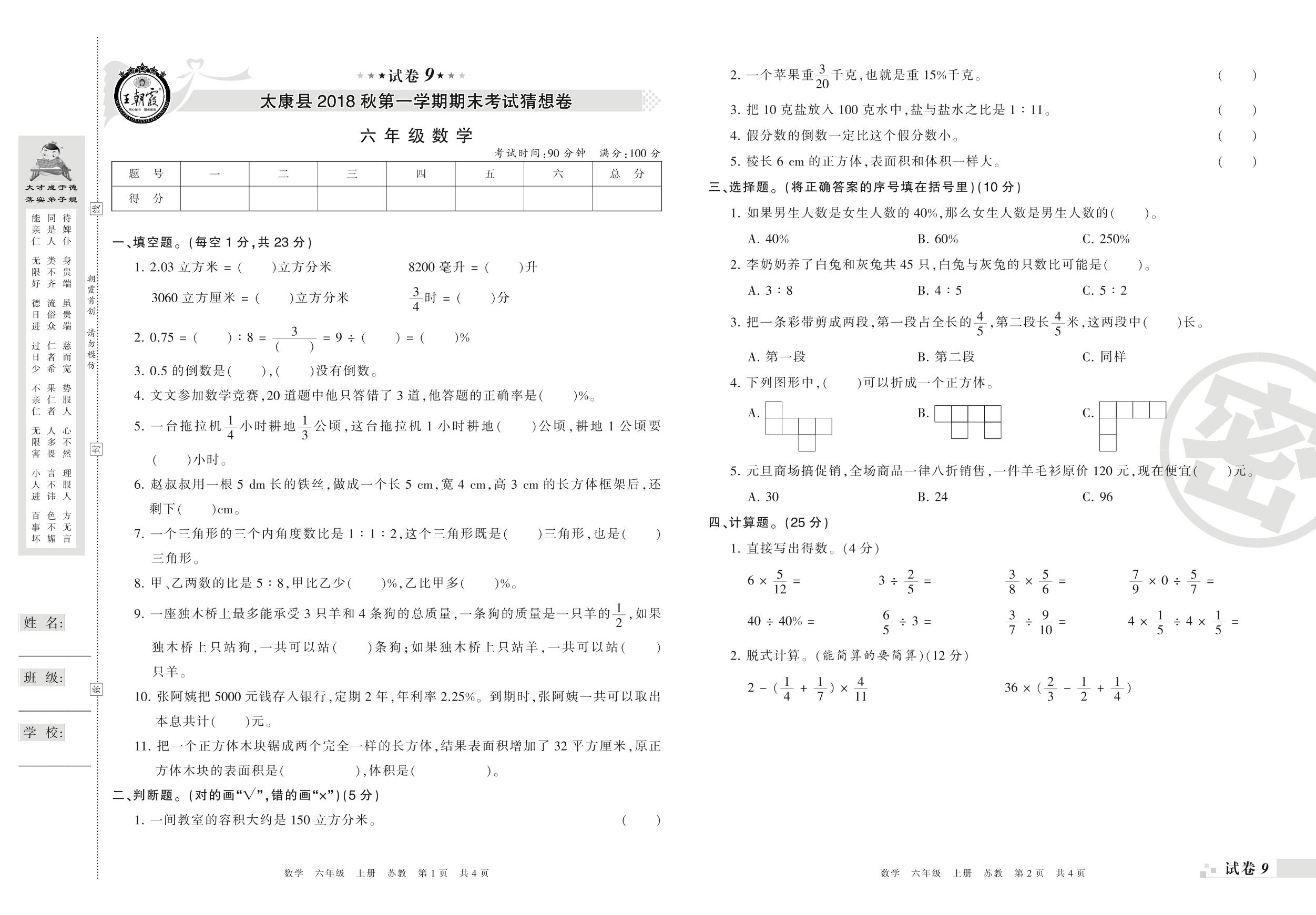 2017-2018学年第一学期周口市太康县六年级数学试卷(苏教版)【9】