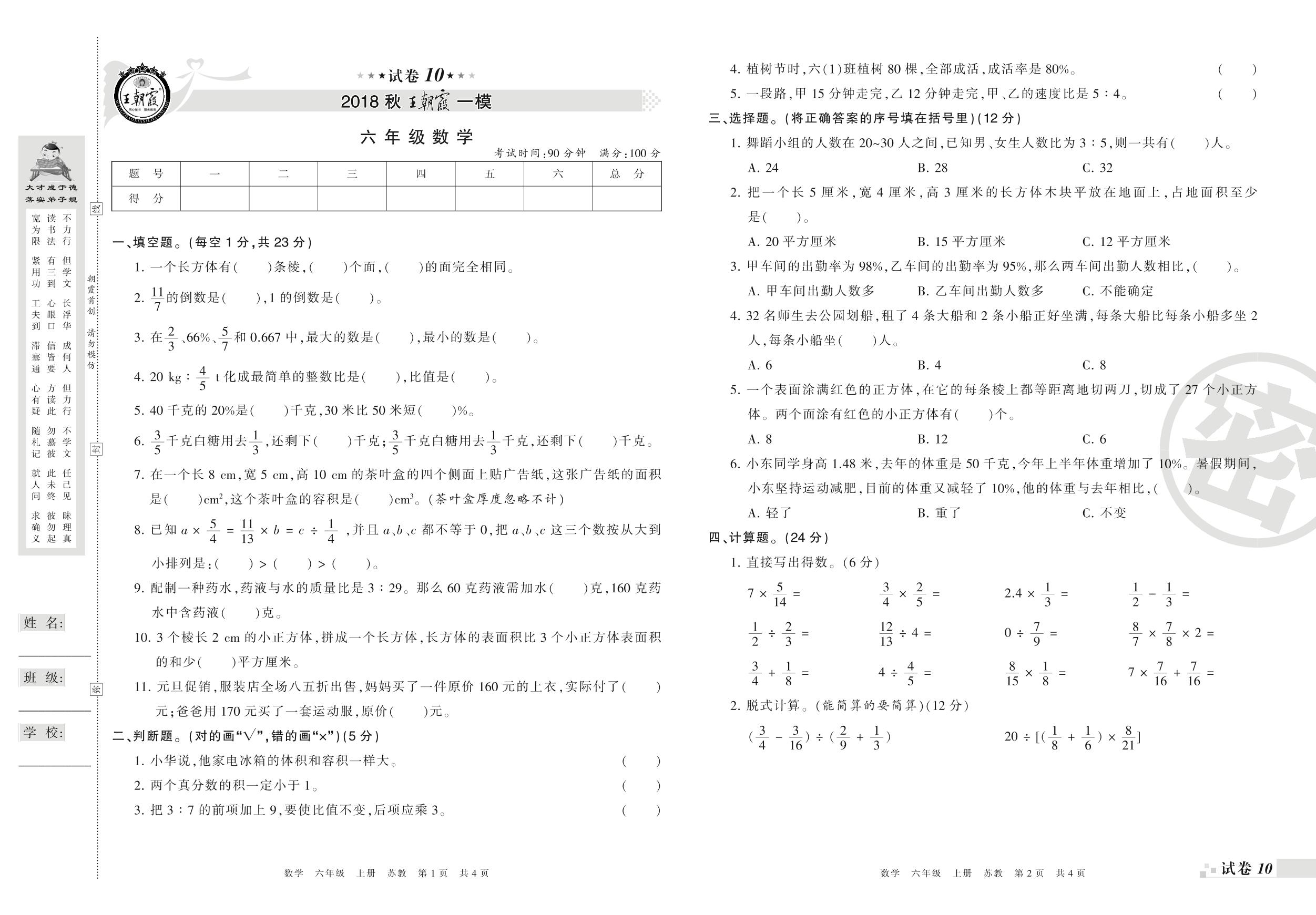 王朝霞期末模拟卷六年级上册数学(苏教版)_R210805105949【10】