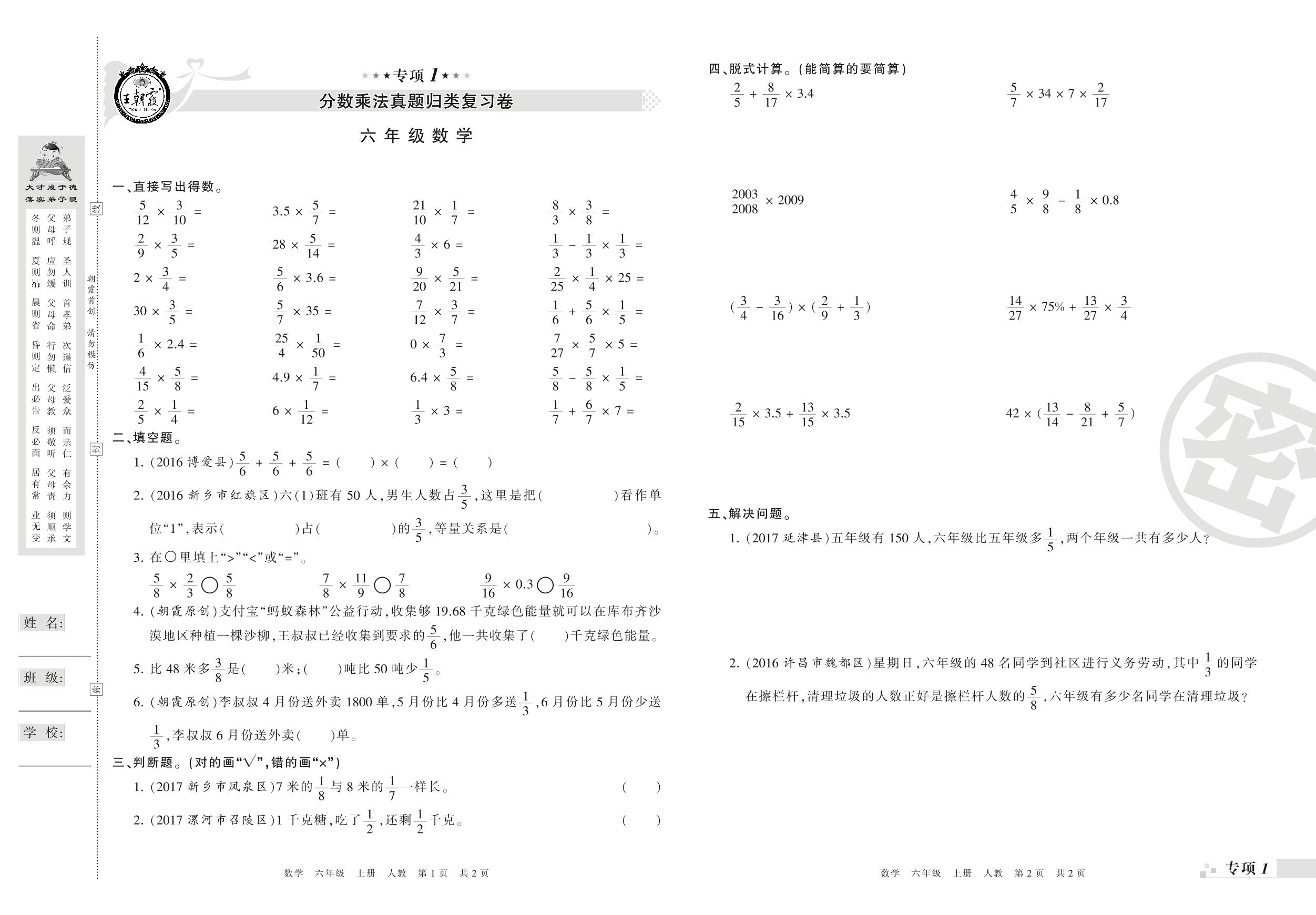 王朝霞期末专项卷——分数乘法、分数除法(一)真题归类复习卷六年级上册数学(人教版)_R210805105953【0】