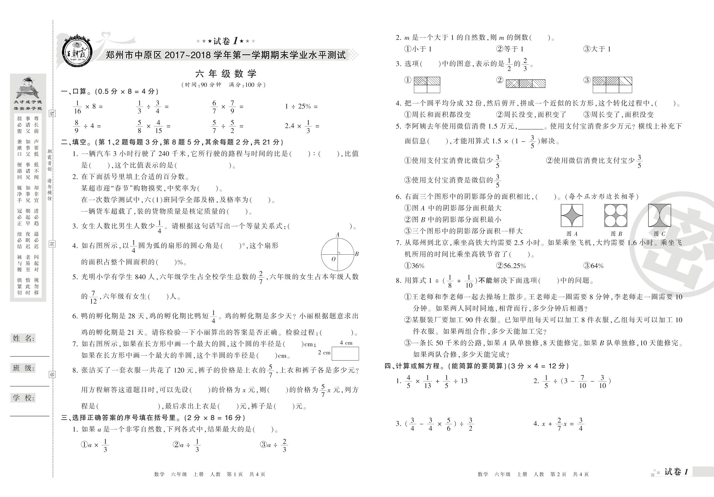 2017-2018学年第一学期郑州市中原区六年级数学试卷(人教版)_R210805110012【1】