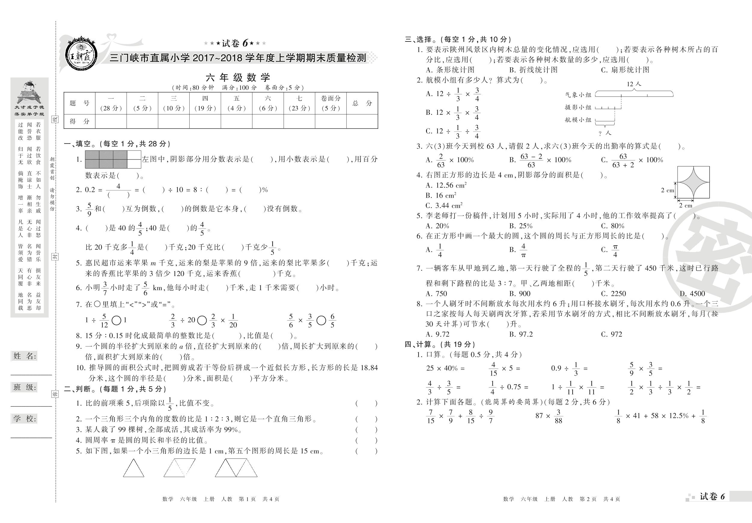 2017-2018学年第一学期三门峡市六年级数学试卷(人教版)【6】