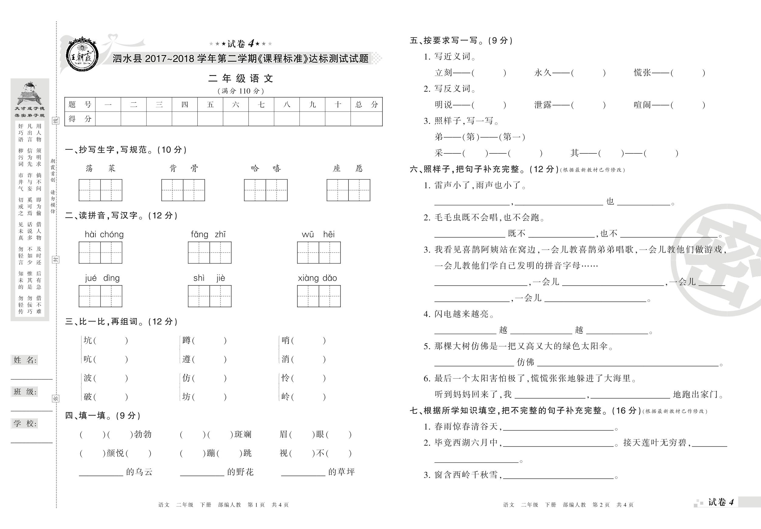 2017-2018学年第二学期济宁市泗水县二年级语文试卷(人教版)【4】