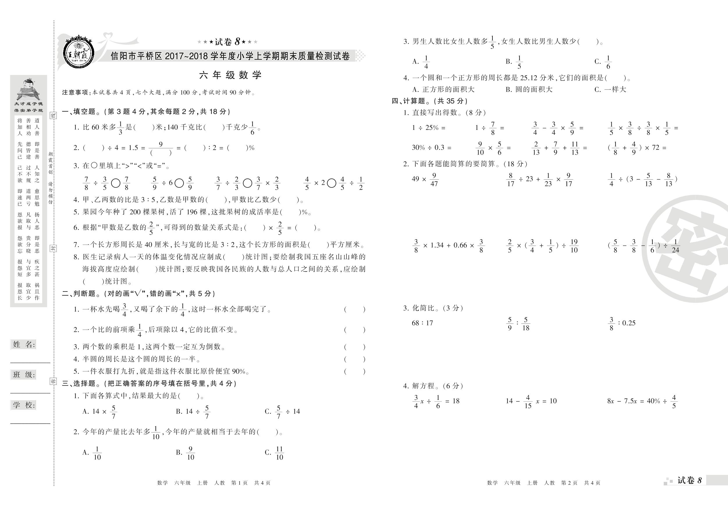 2017-2018学年第一学期信阳市平桥区六年级数学试卷(人教版)【8】